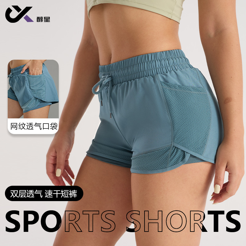 新型の光防止運動フィットネス半ズボンの女性のゆったりしたネットの糸は偽の2つの速乾のズボンのヨガの半ズボンの欧米をつなぎ合わせます。