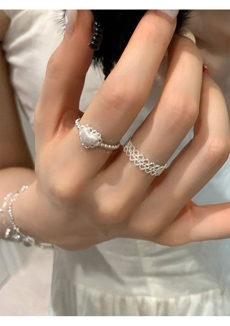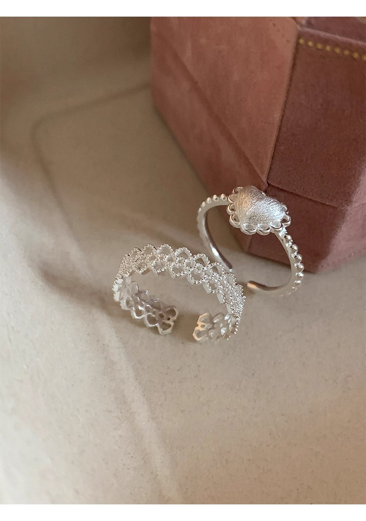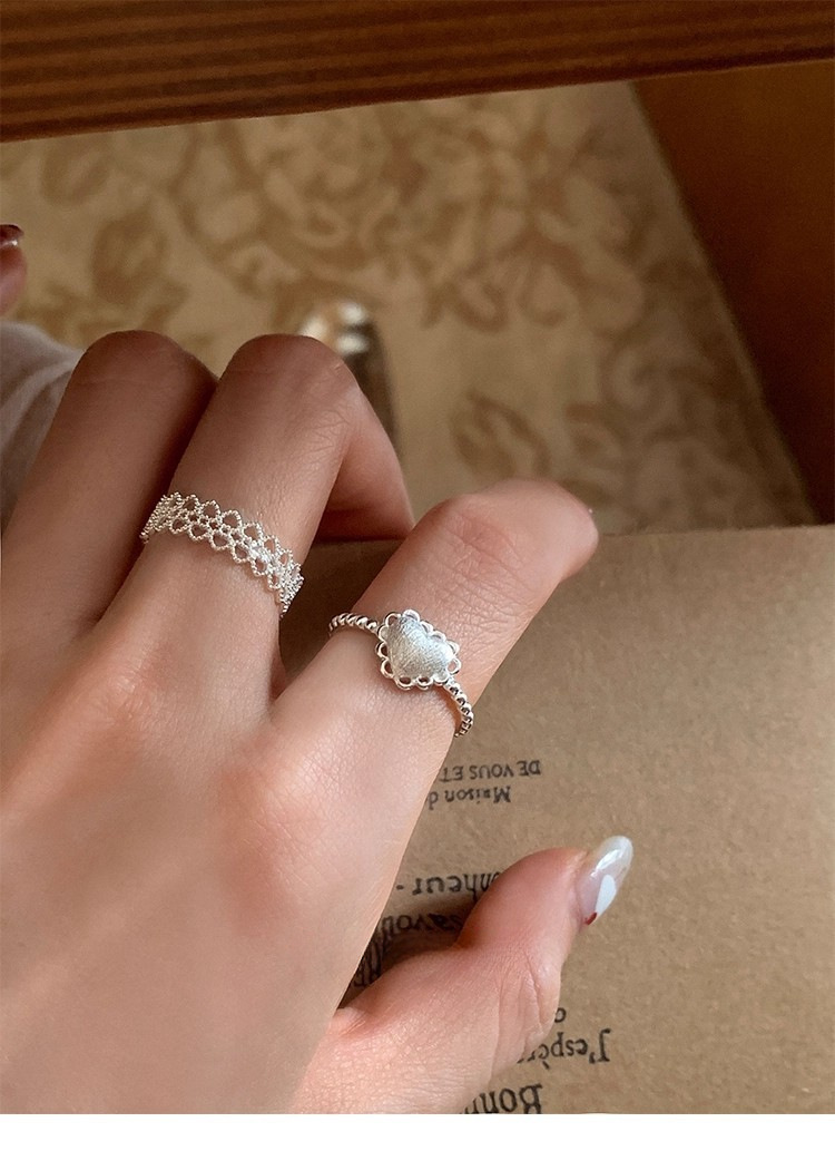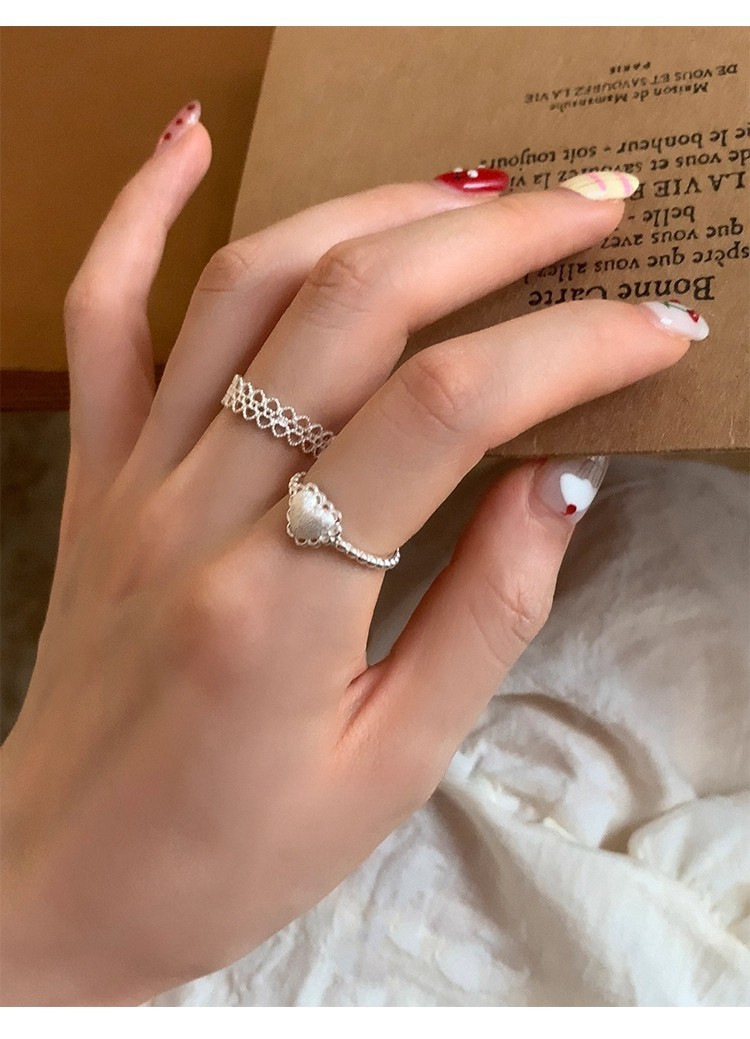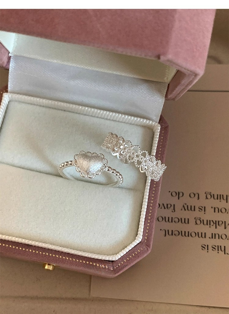 925银镂空蕾丝花边爱心磨砂拉丝戒指ins风小众设计叠戴食指戒可调