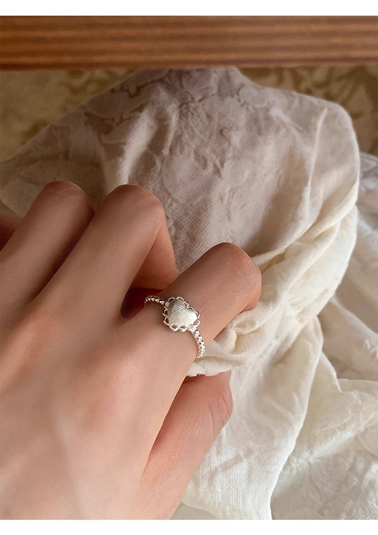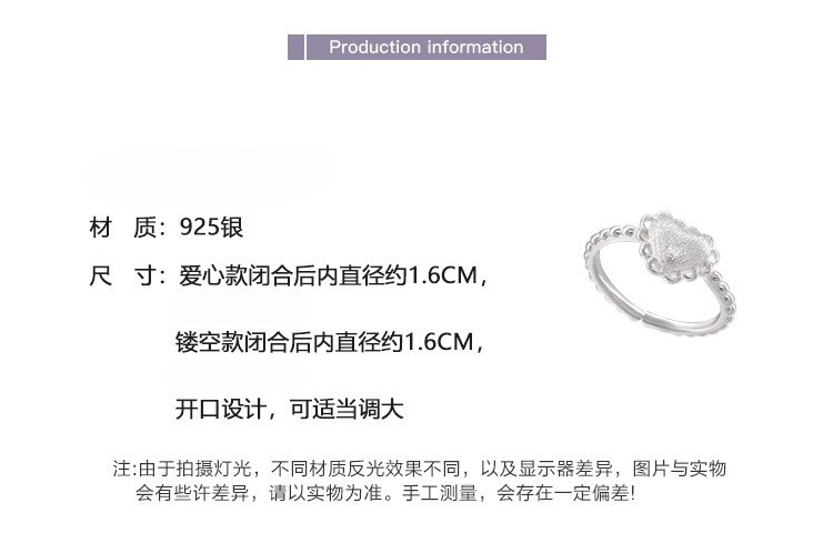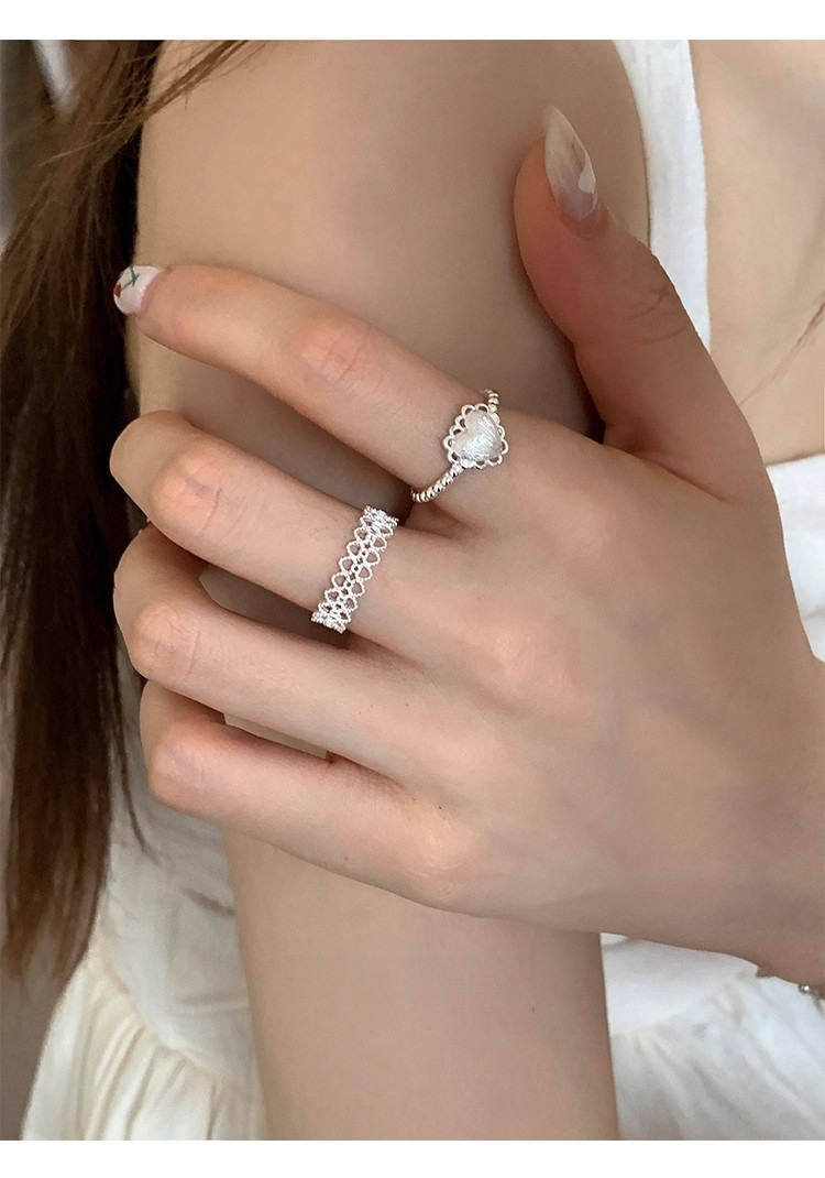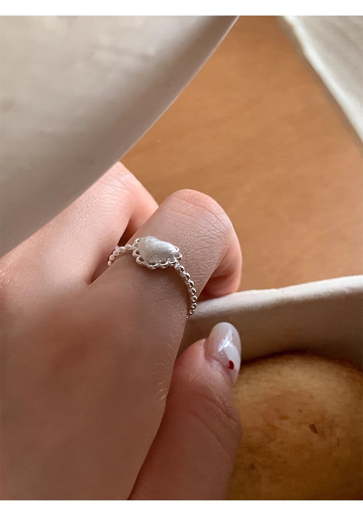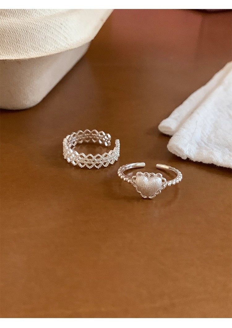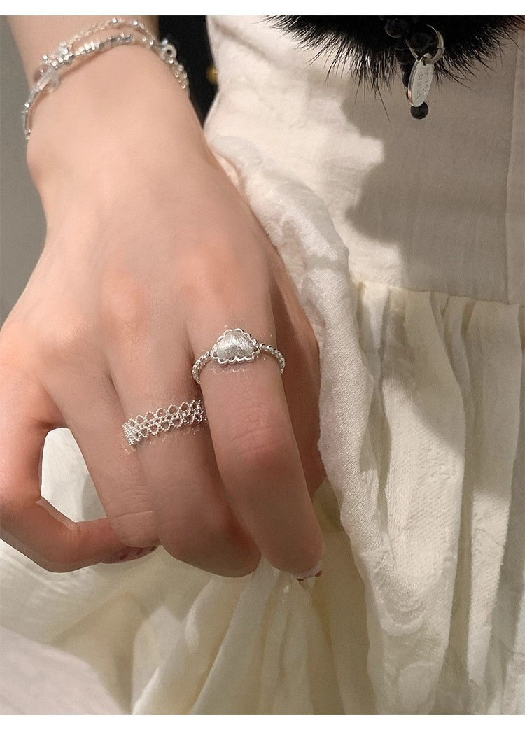 925银镂空蕾丝花边爱心磨砂拉丝戒指ins风小众设计叠戴食指戒可调
