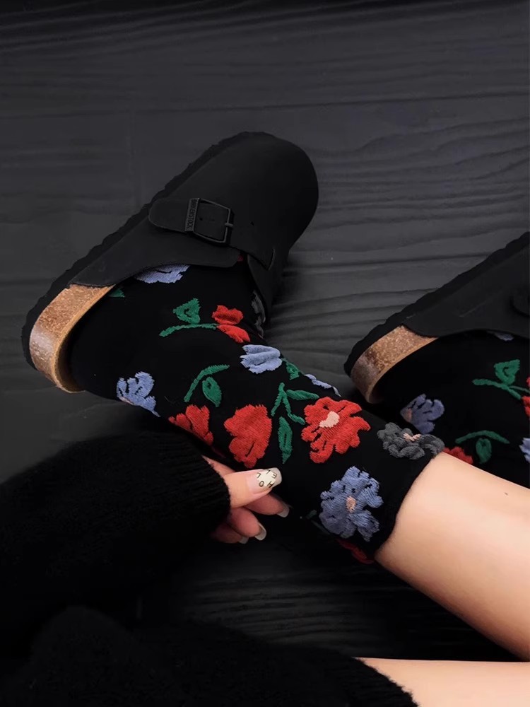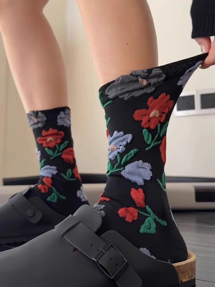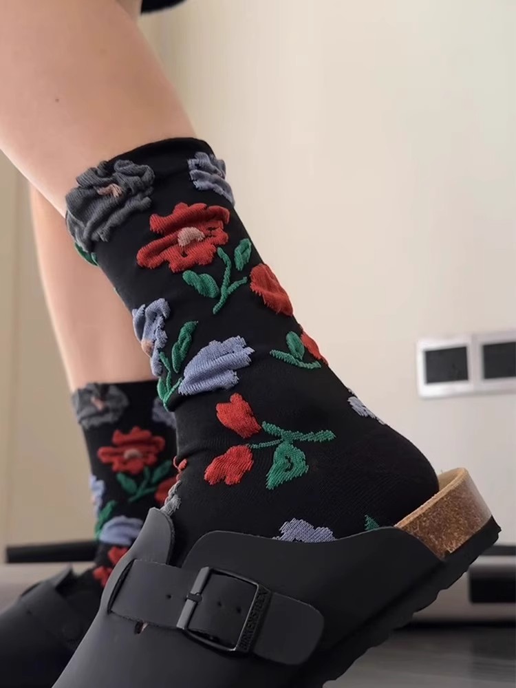 女性用純綿ソックス 秋冬 ミドル丈 立体フラワー柄ソックス 小花柄 日本風 トレンド インターネット人気 カジュアルソックス 女性用ソックス 卸売