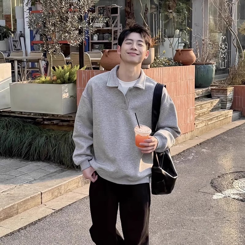 浅灰色Polo衫长袖男春秋cleanfit重磅翻领卫衣美式复古高级感外套