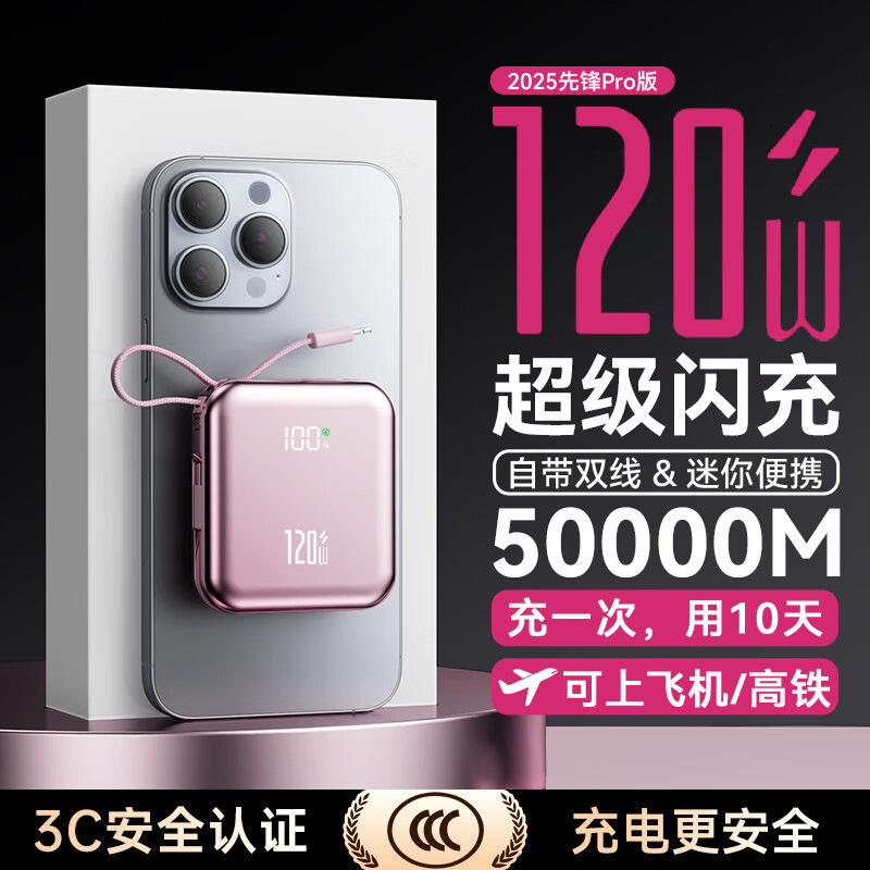 新国标3C认证可上飞机大容量充电宝自带线超级快充迷你便携小巧