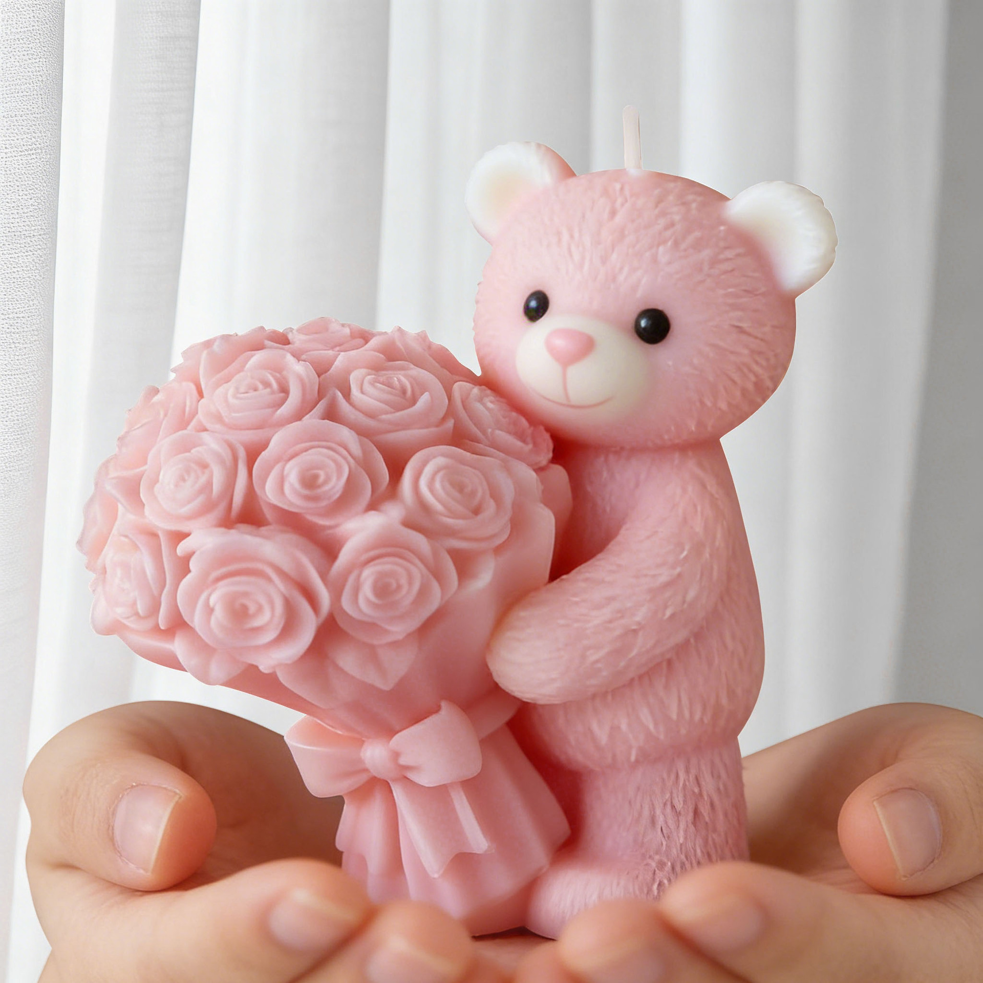 嘉汇美 情人节小熊蜡烛模具diy抱玫瑰花小熊香薰蜡烛石膏摆件模具
