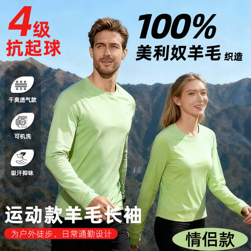 美利奴羊毛运动上衣男女透气速干抗菌长袖登山跑步瑜伽修身打底衫