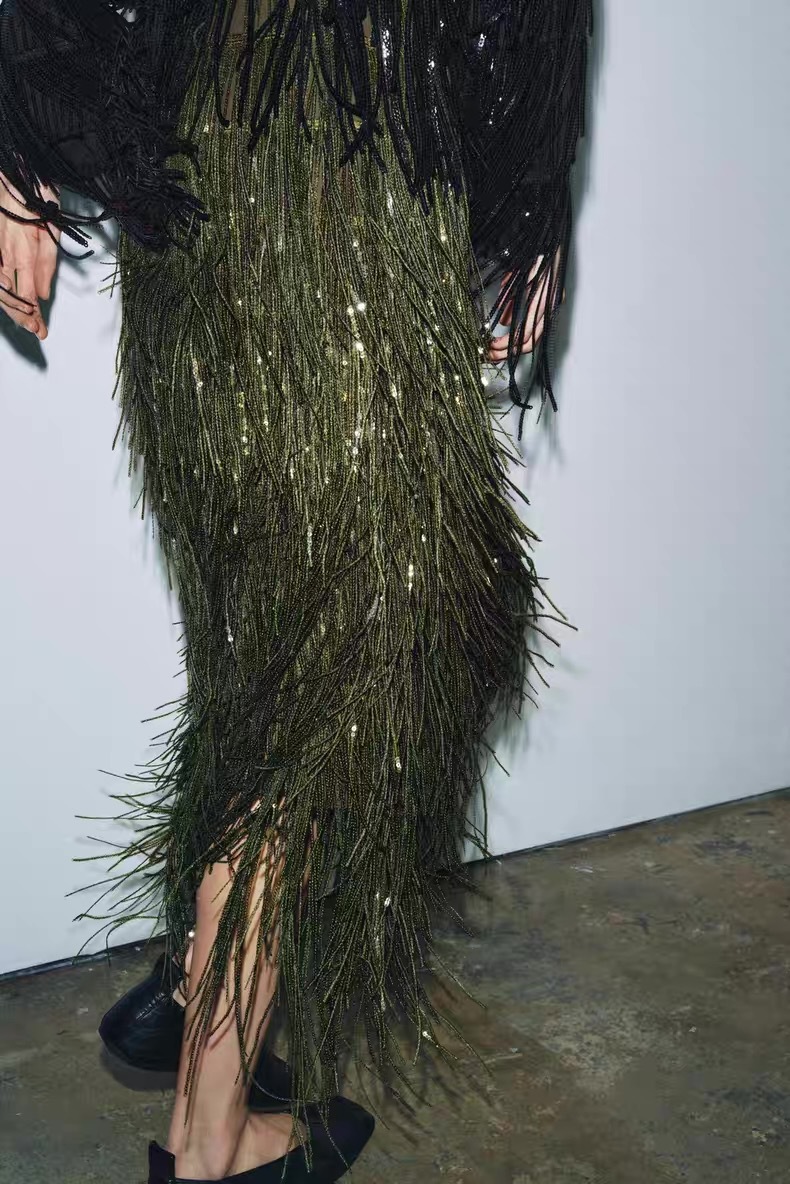 2025年亚马逊秋冬新款绿色流苏长裙修身气质欧美名媛气质女半身裙