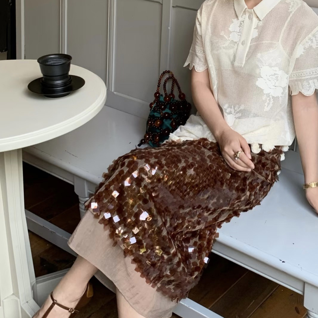 秋冬暖色调焦糖咖色方形亮片闪片百搭高级拼接直筒半身裙