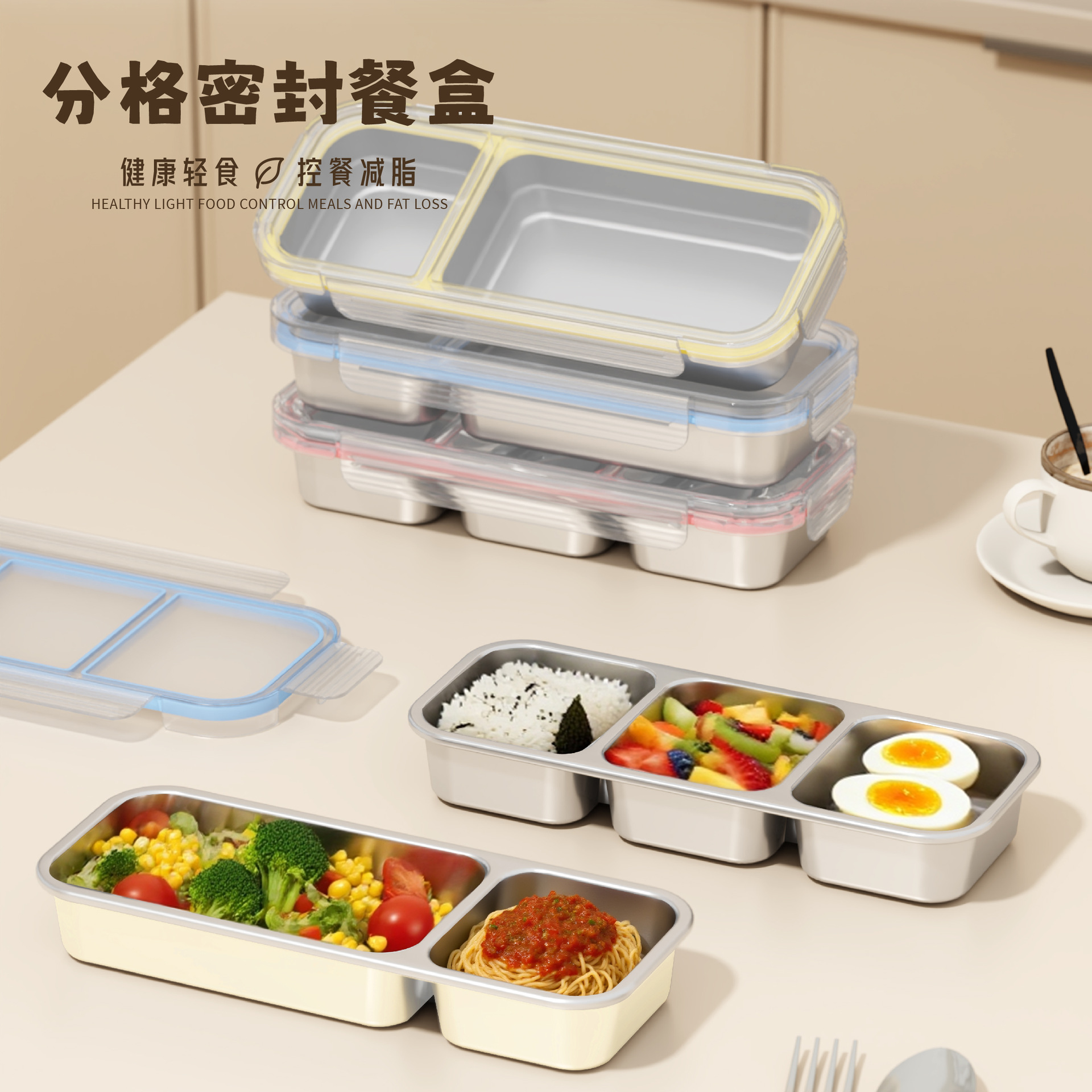 跨境304不锈钢减脂沙拉便当盒定量分装保鲜盒冰箱冷冻盒户外饭盒