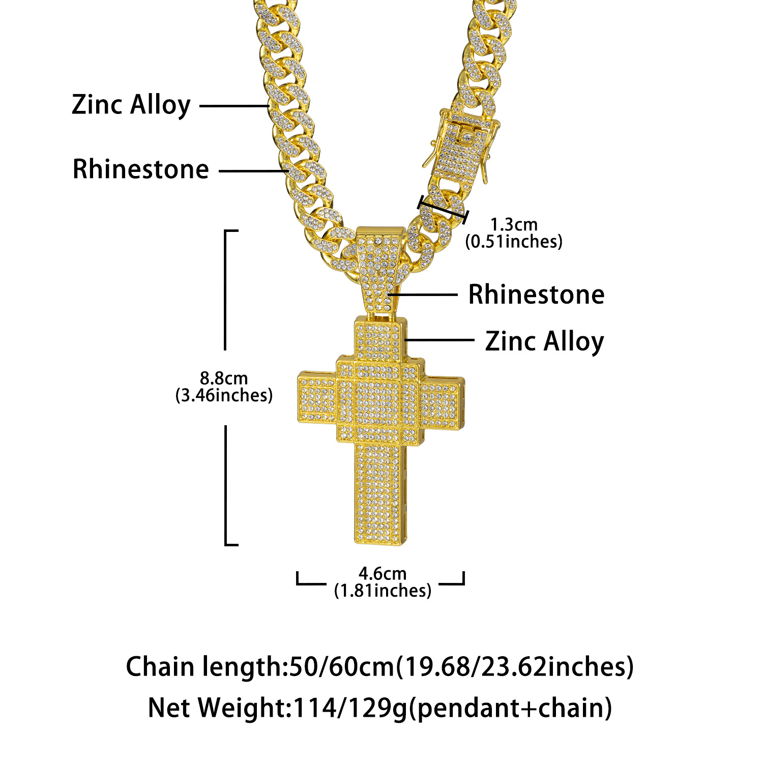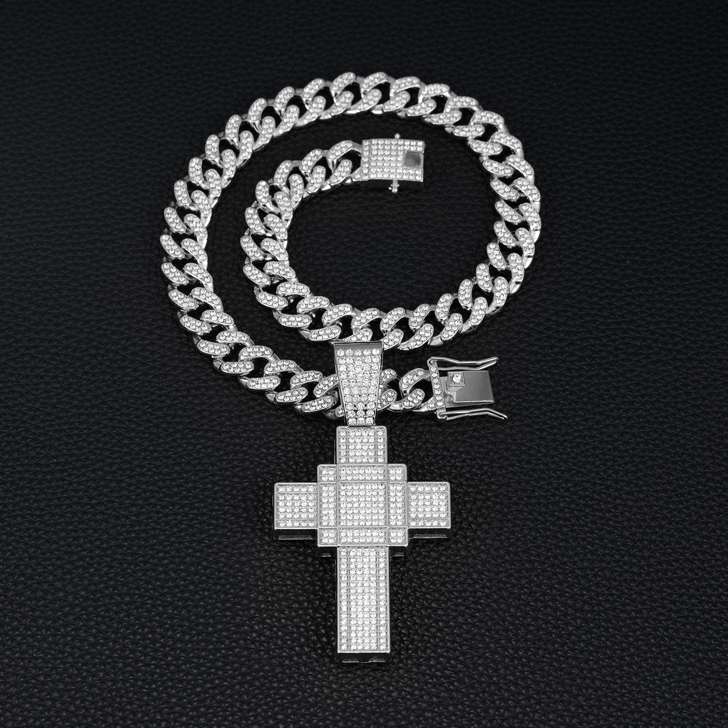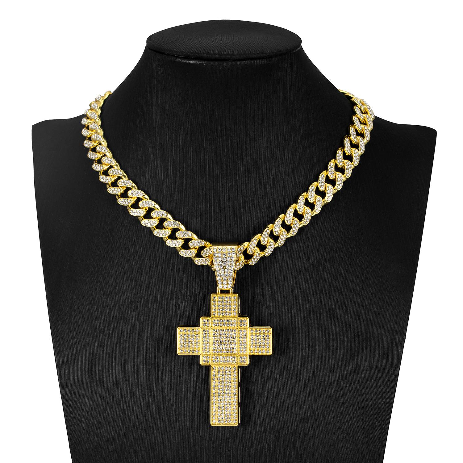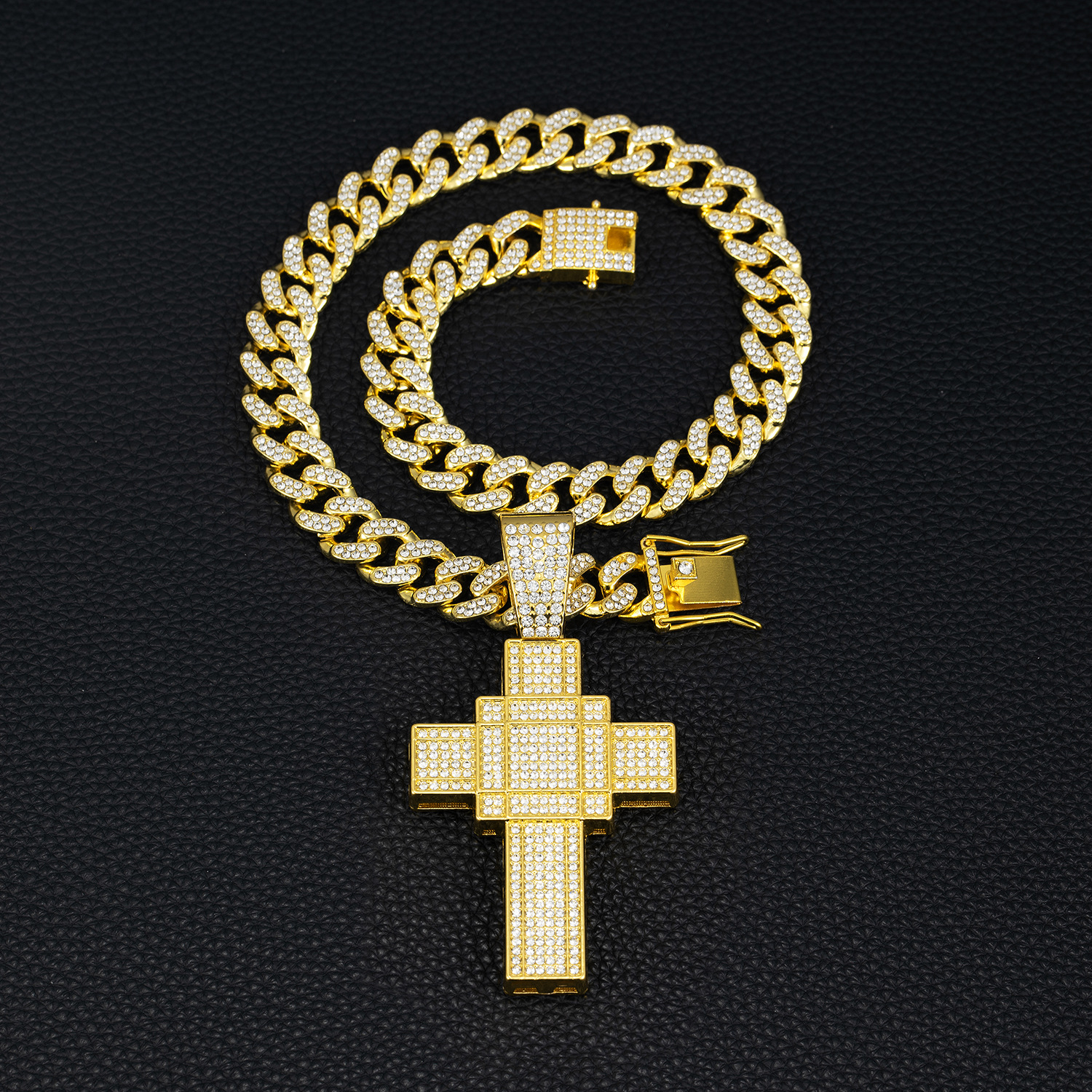 跨境新款复古十字架吊坠合金满钻古巴链欧美嘻哈hiphop项链工厂价