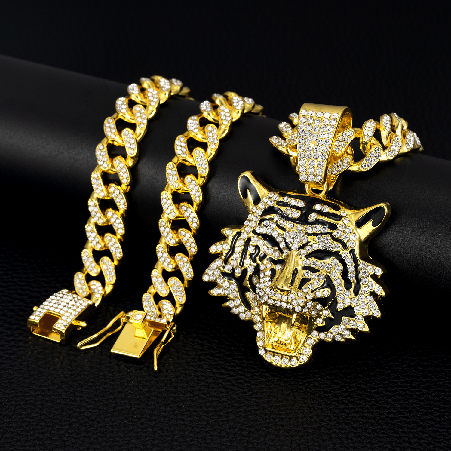 跨境供应欧美嘻哈风虎头合金满钻吊坠13mm古巴链大金链子外贸饰品