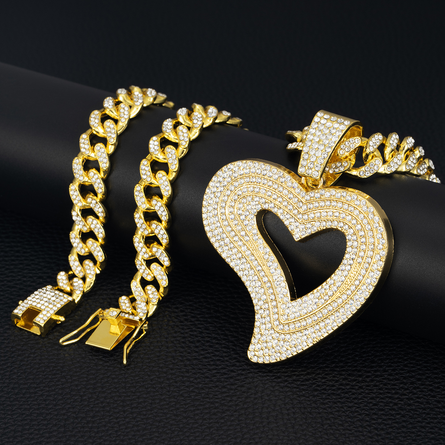 热卖欧美跨境新款轻奢大号爱心满钻合金吊坠古巴项链嘻哈潮男饰品