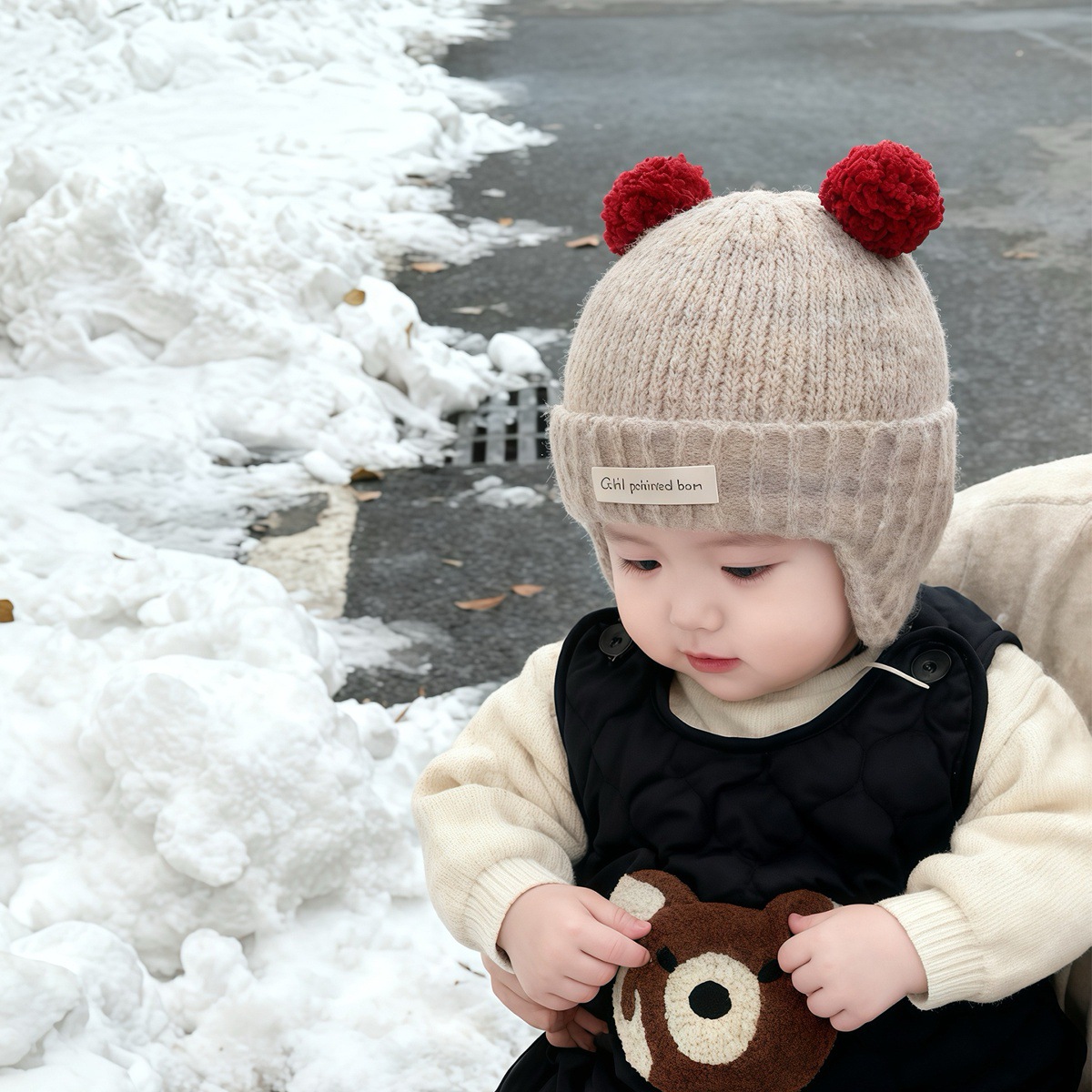 宝宝帽子冬天毛线帽洋气加厚保暖小月龄婴幼儿针织护耳帽防风帽韩