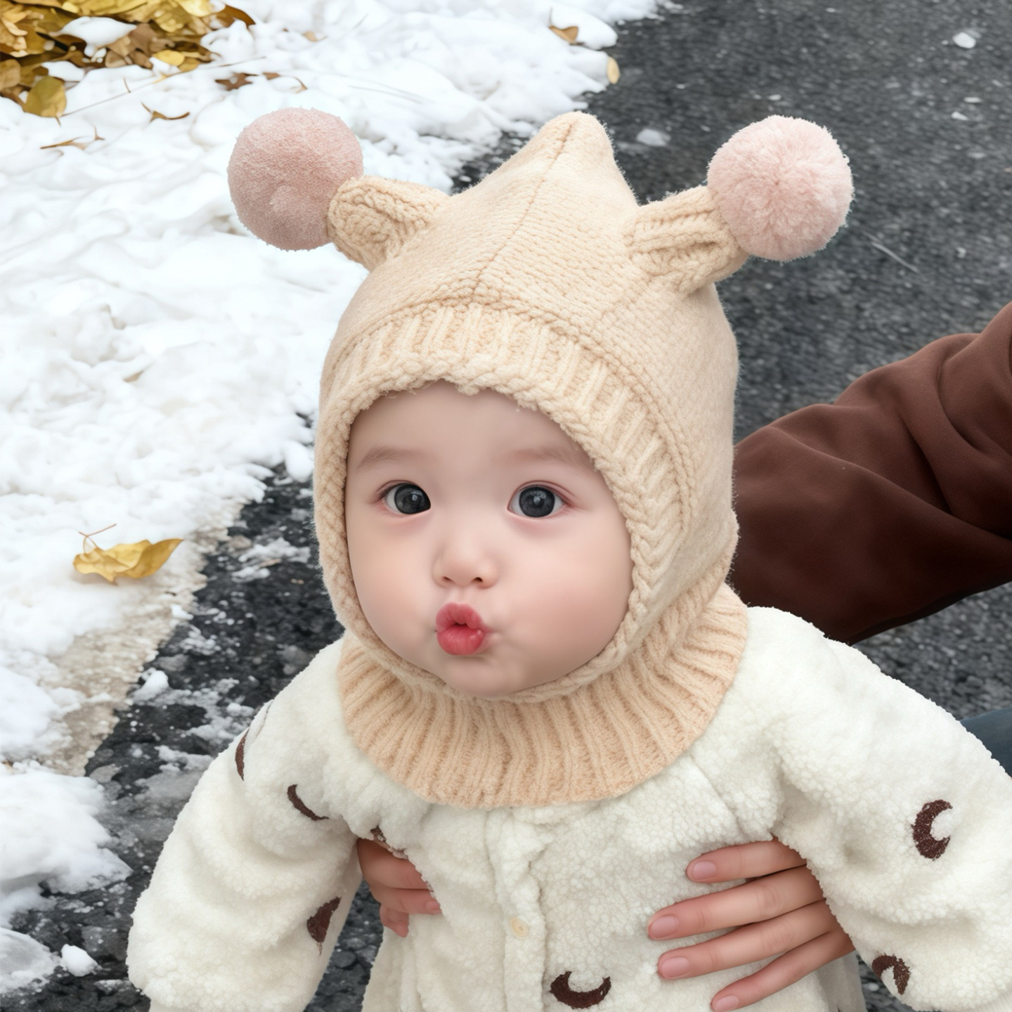 宝宝帽子冬天毛线帽针织围脖一体帽小月龄婴幼儿加厚保暖护耳帽韩