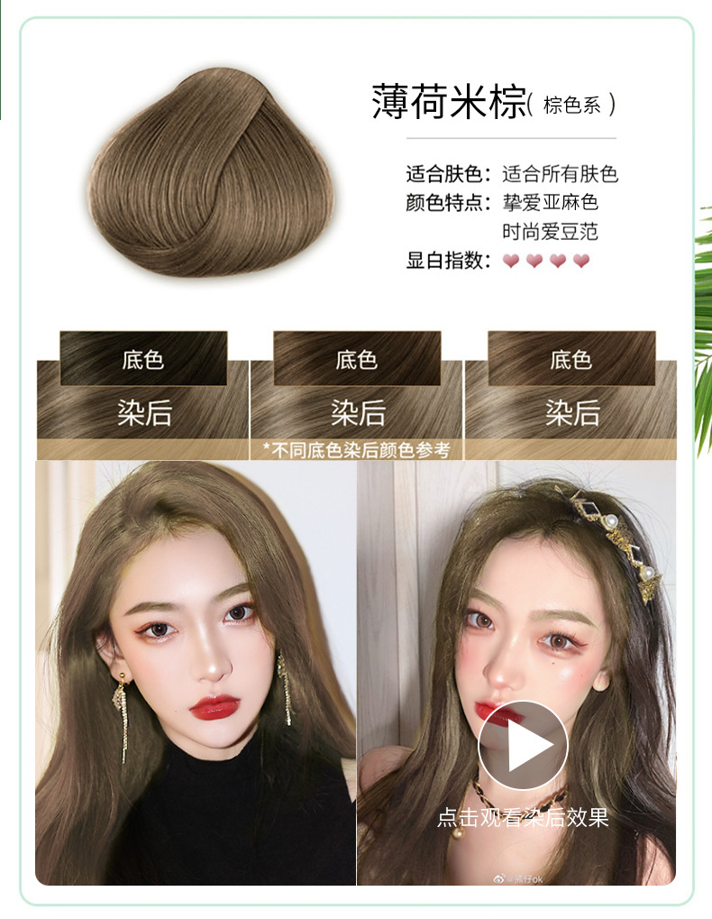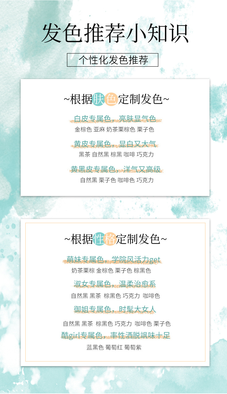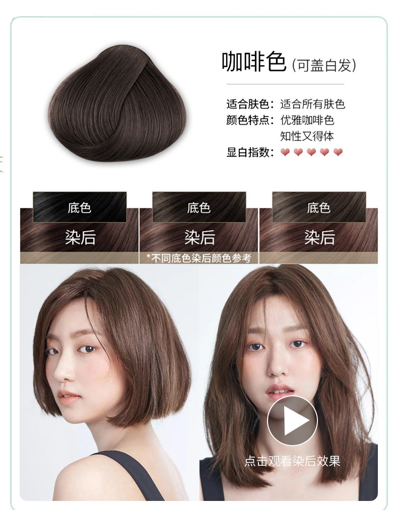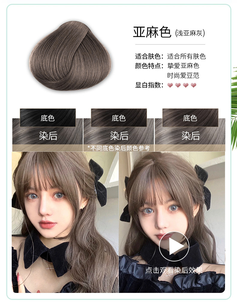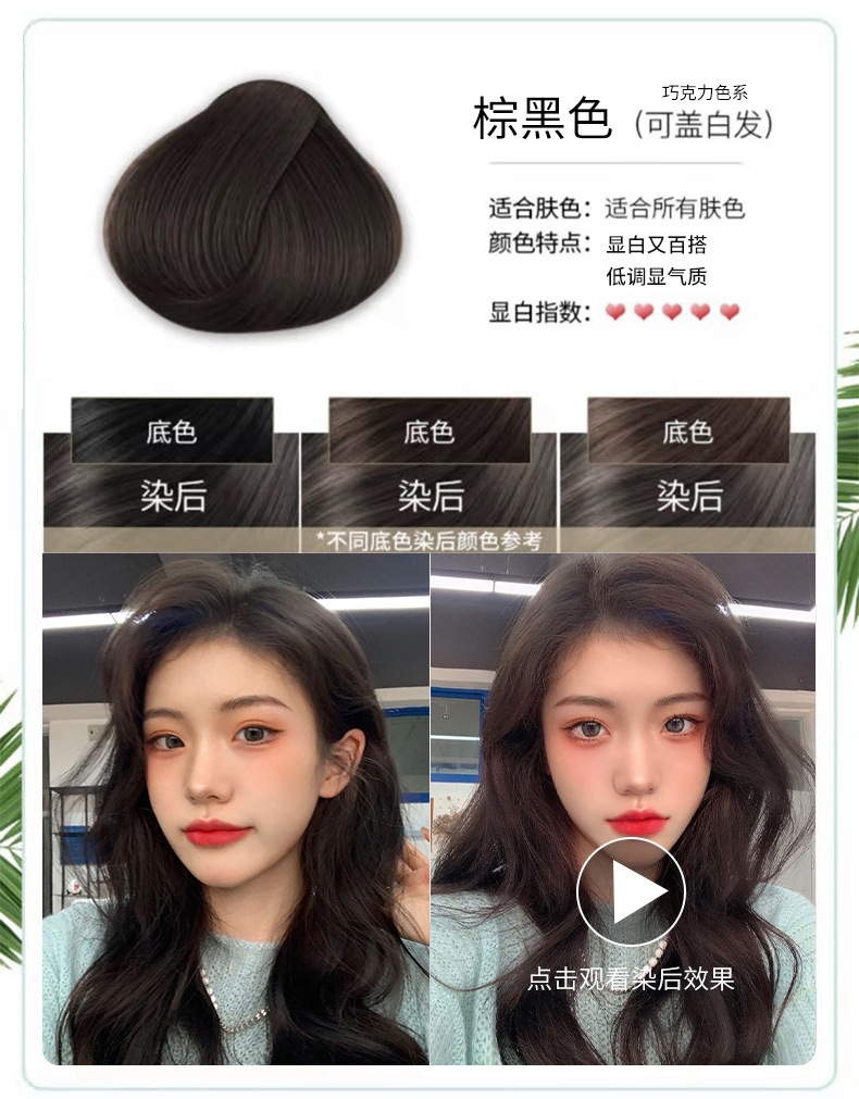 颜色 自然黑(可盖白),栗棕色-偏暗(可盖白),栗棕色-偏亮(不盖白),黑茶色(可盖白),棕黑色(可盖白),巧克力色(可盖白),咖啡色(可盖白),蓝黑色(可盖白),金棕色(不盖白),板栗子色(可盖白),葡萄红(可盖白),紫黑色(可盖白),波尔冷棕色(可盖白),闷青亚麻(可盖白),亚麻色(不盖白)