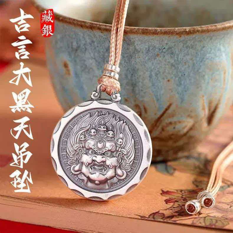 大黑天吉言吊坠藏式民族风复古做旧黑财神招财转运圆牌挂件可过检