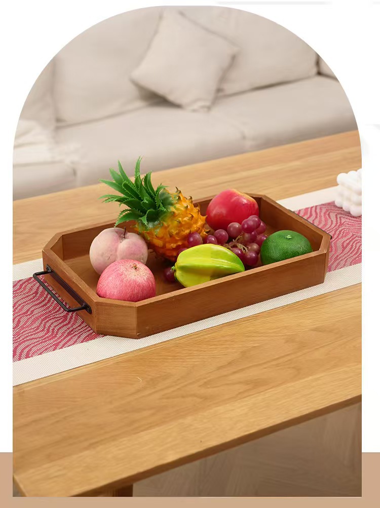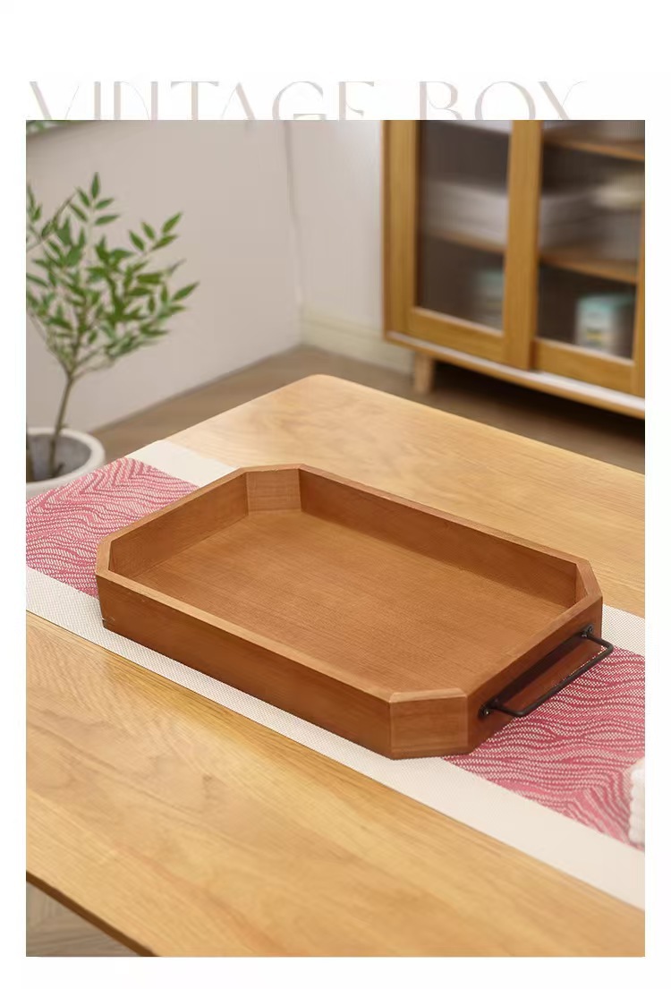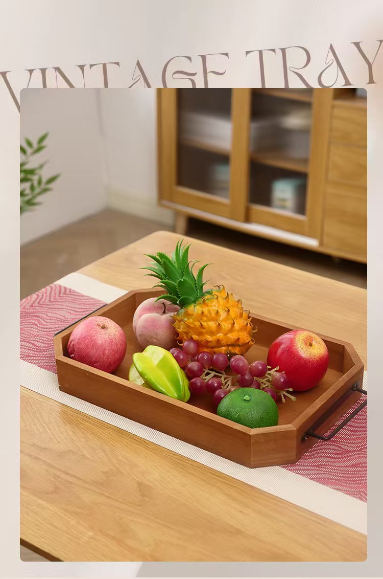 レトロな長方形の無垢材トレイ、鉄製ハンドル付き、家庭用アフタヌーンティー、軽食トレイ、コーヒートレイ、パン、フルーツディスプレイ用トレイ