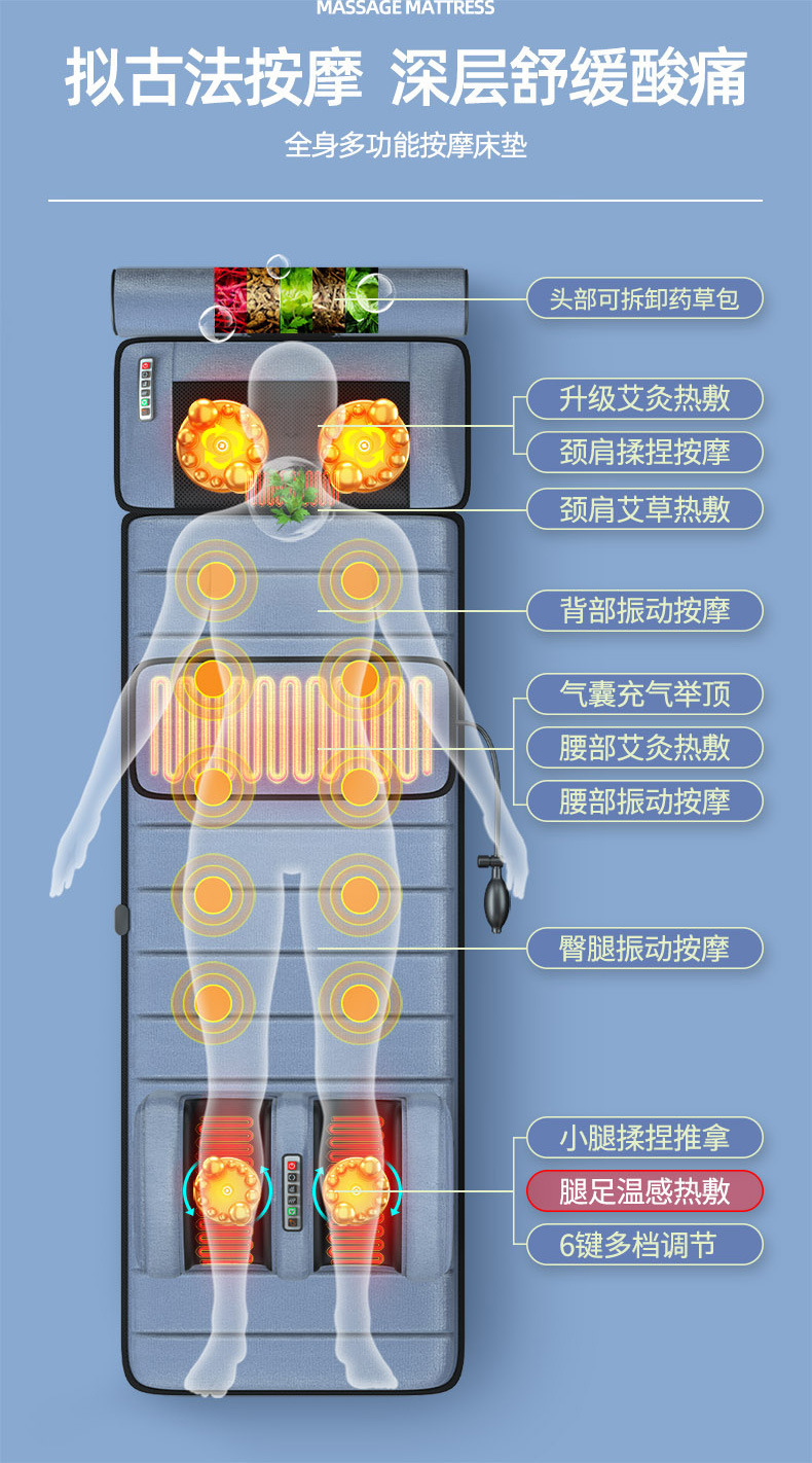 跨境多功能颈椎腰椎按摩床垫腰部气囊艾草热敷家用智能按摩靠垫