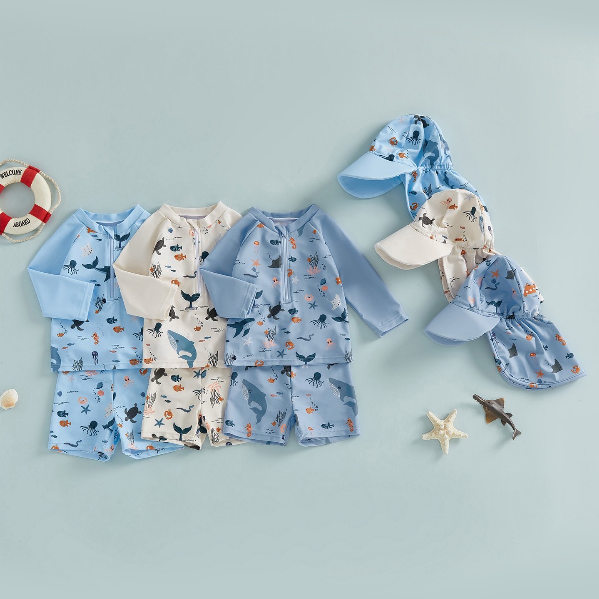 新款跨境新款儿童泳衣儿童男孩6M月-4Y岁长袖休闲三件套男童泳衣
