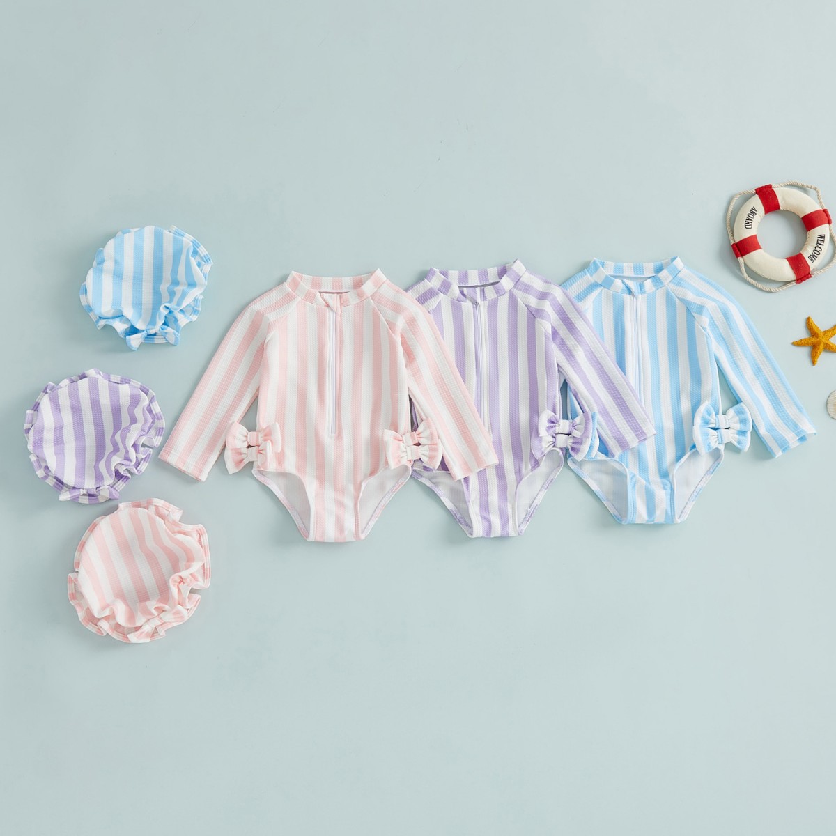 新款欧美儿童泳衣连体带帽拉链条纹可爱蝴蝶结泡泡布小女童游泳衣