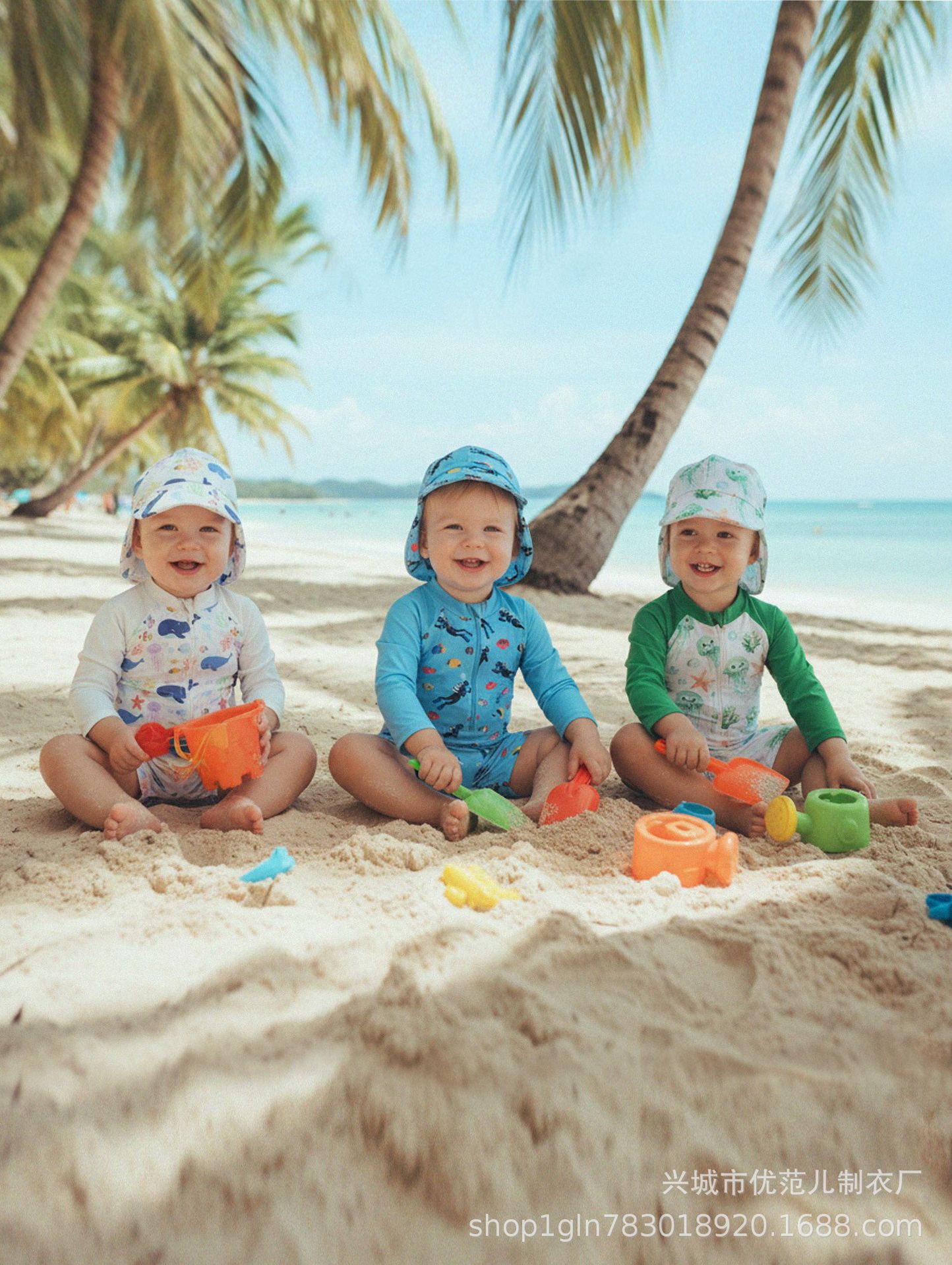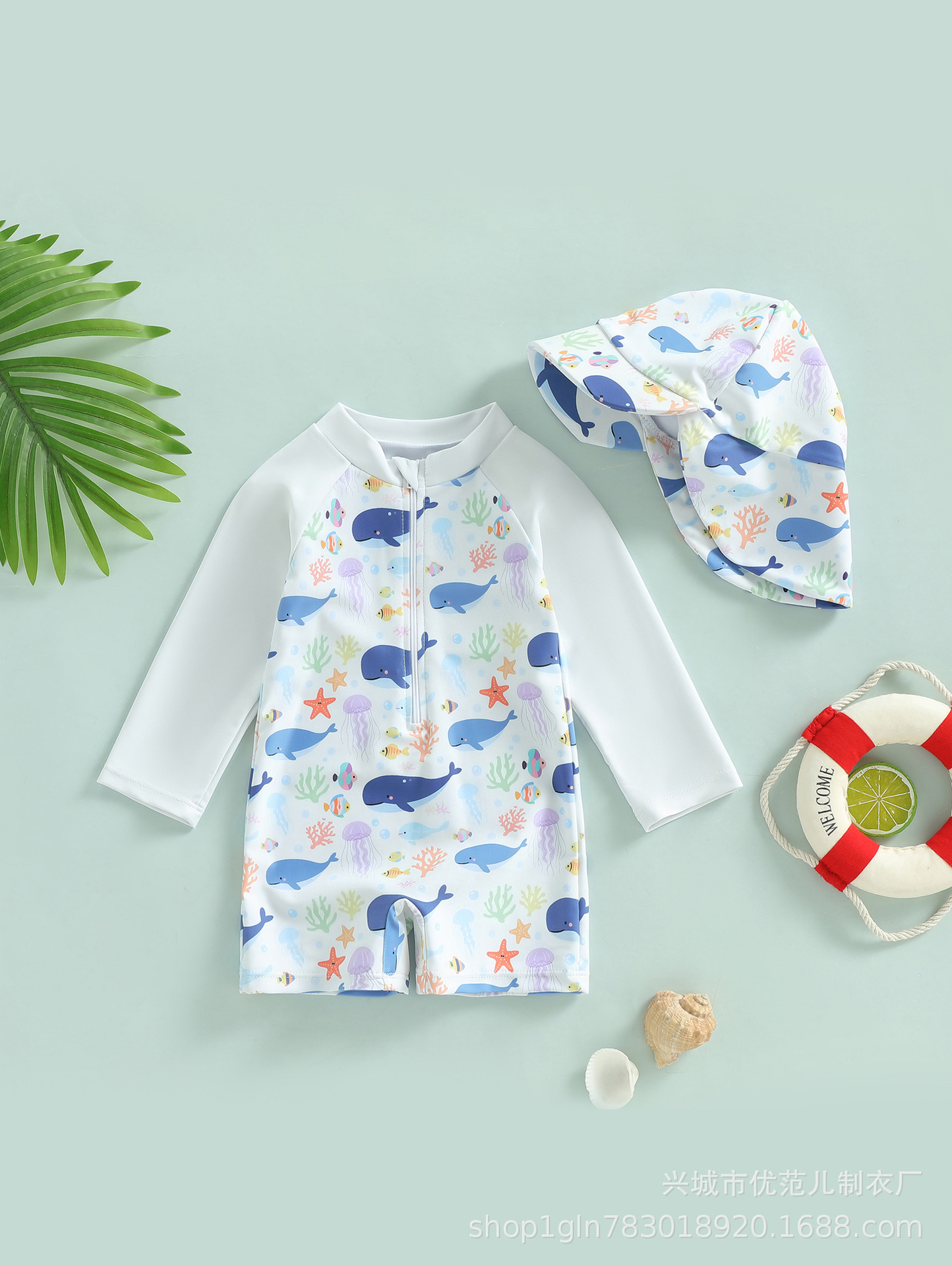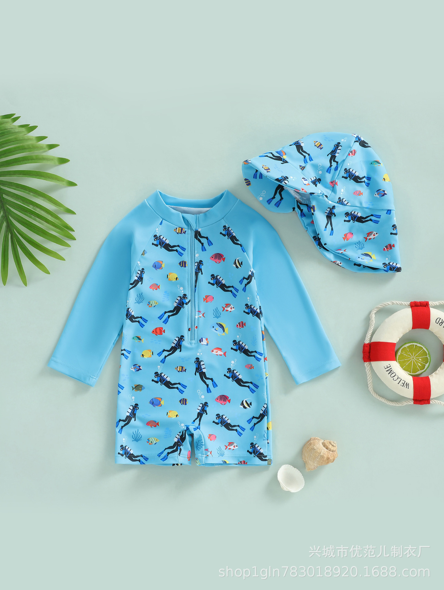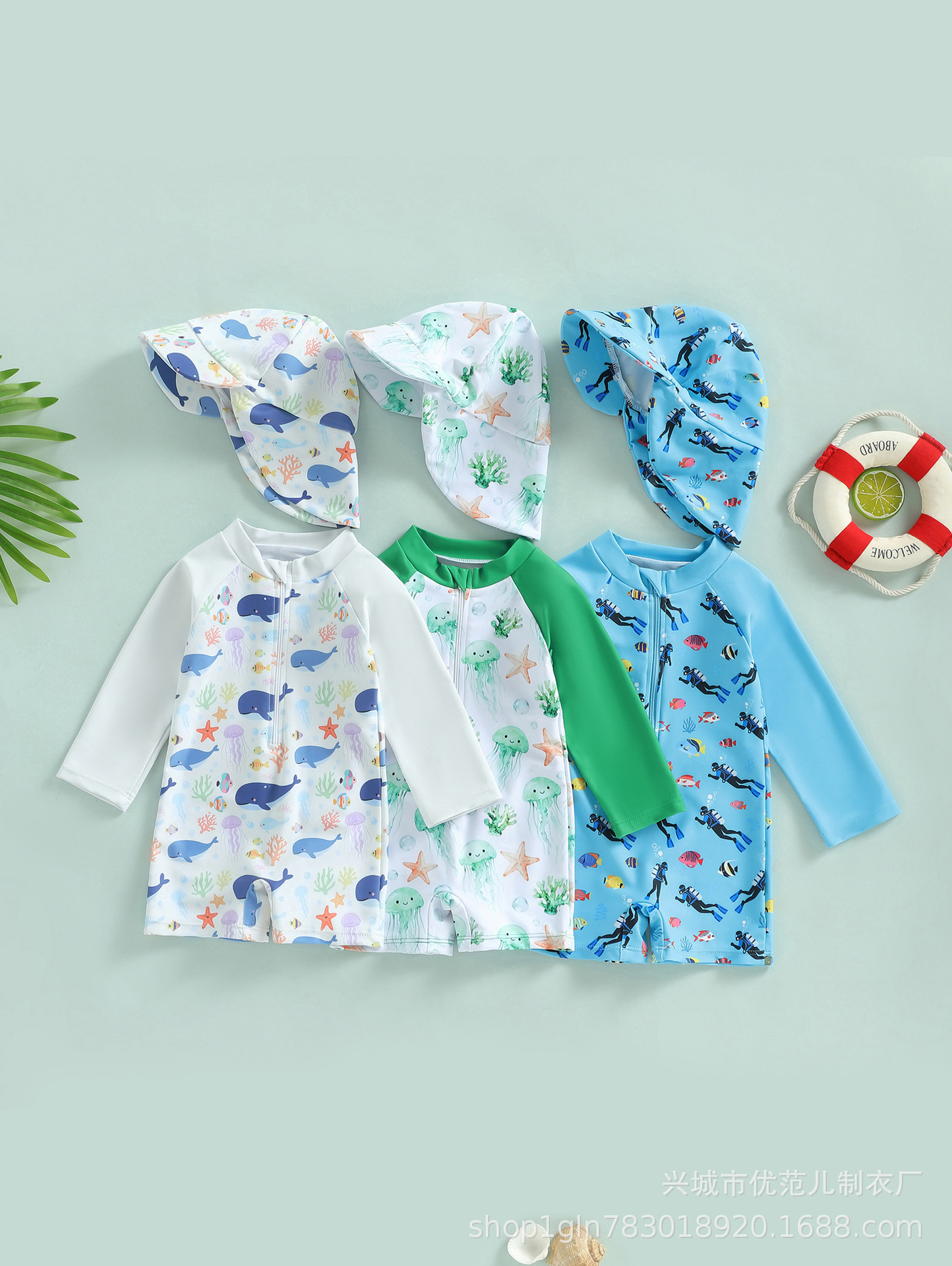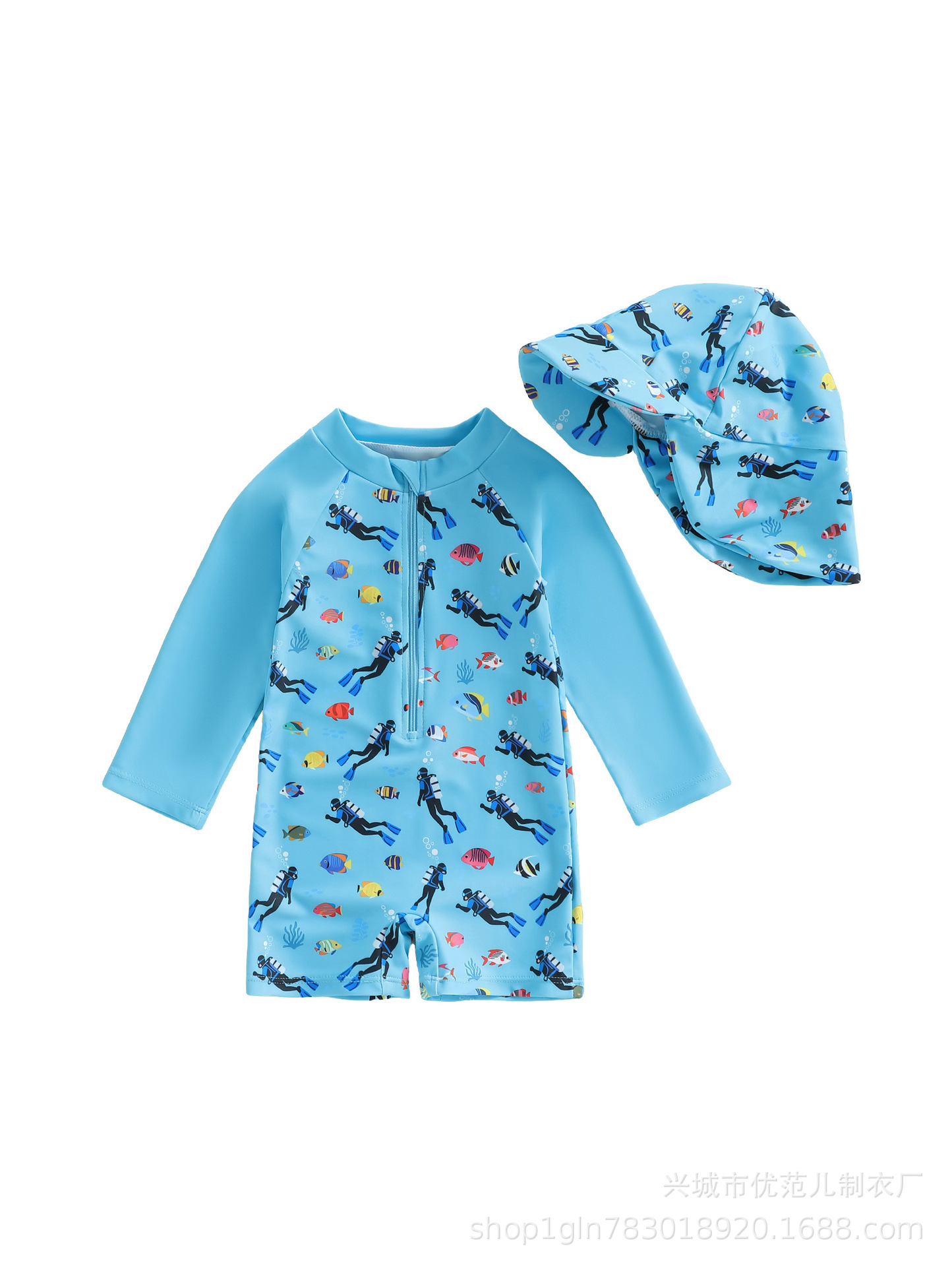 新款跨境童装男童满印连体泳衣男宝宝半开襟连体衣儿童泳衣+帽子