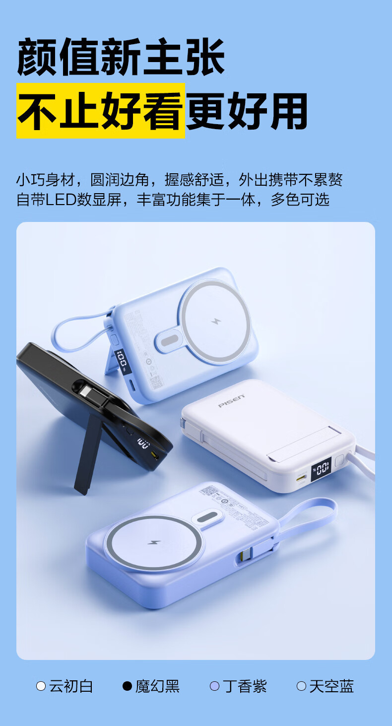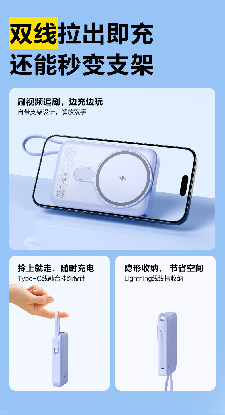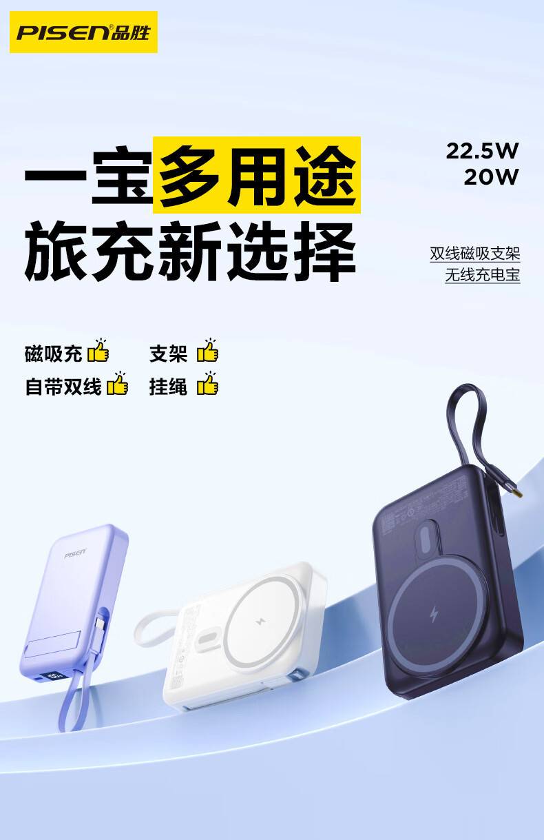 【3C认证】品胜磁吸充电宝22.5W自带双线MagSafe支架快充10000mAh