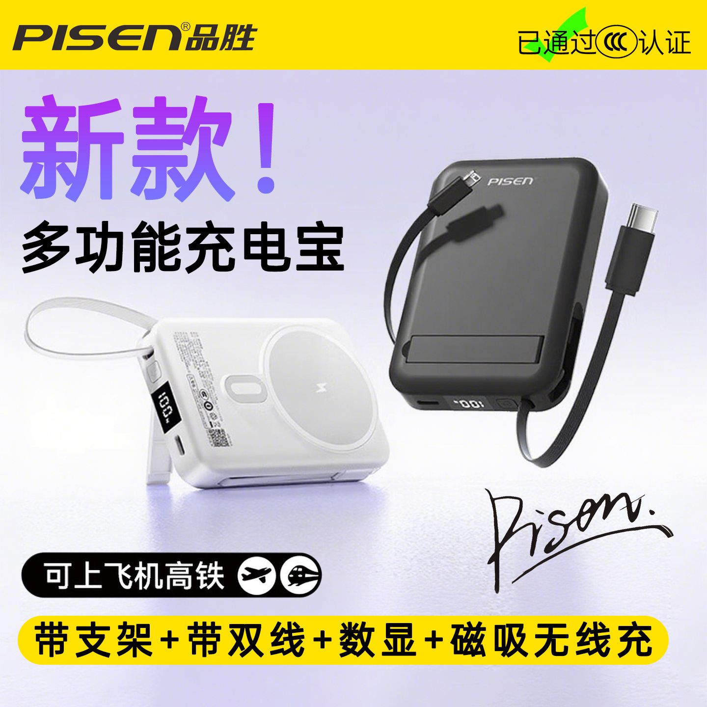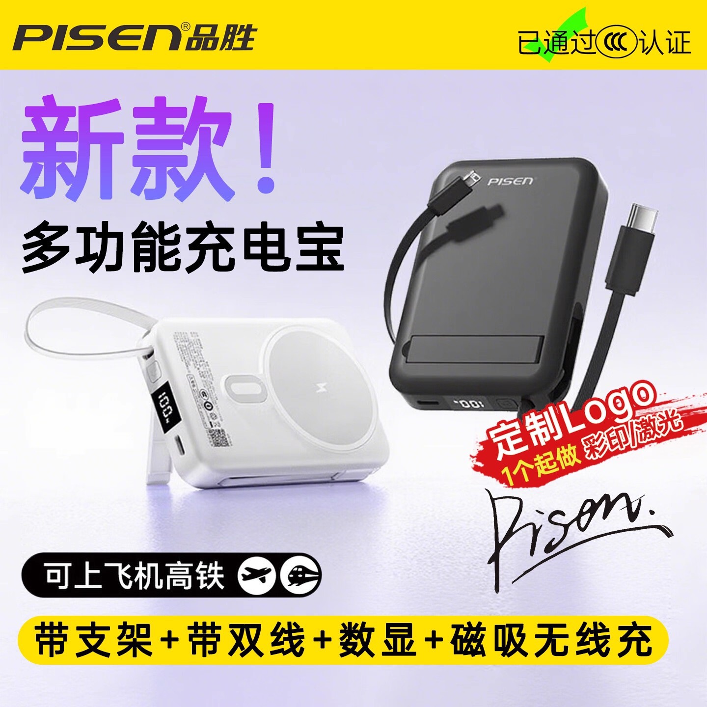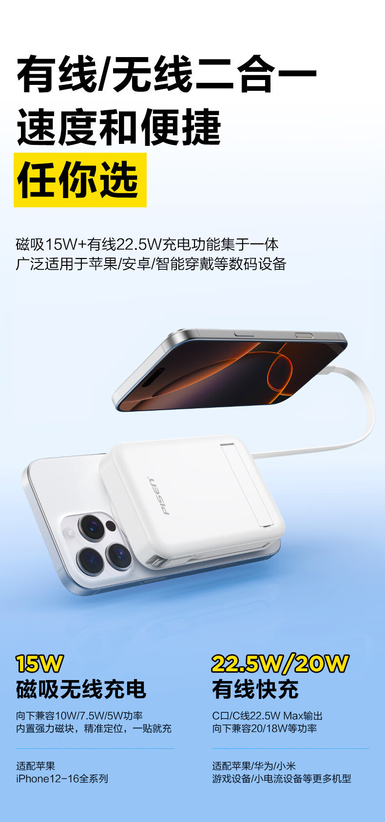 【3C认证】品胜磁吸充电宝22.5W自带双线MagSafe支架快充10000mAh