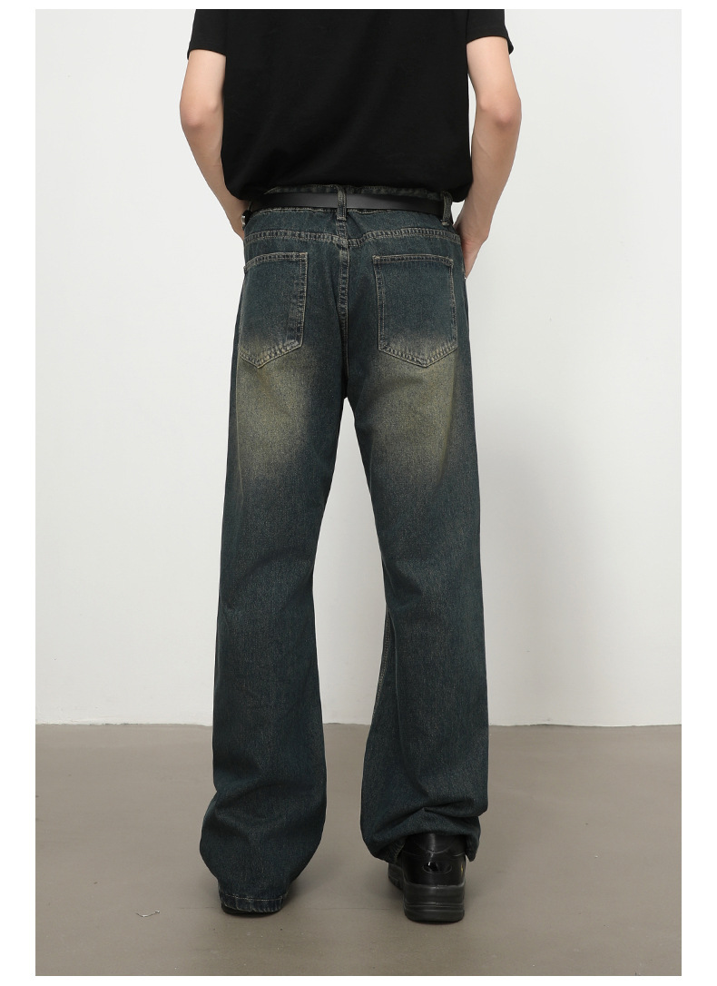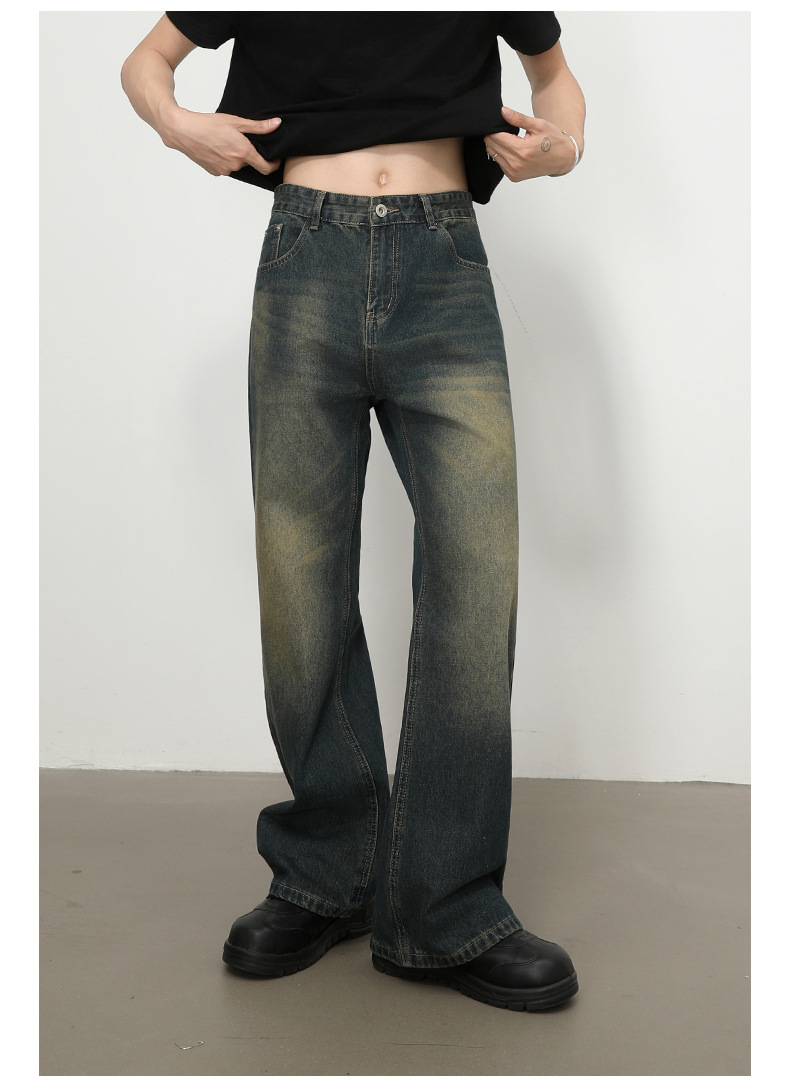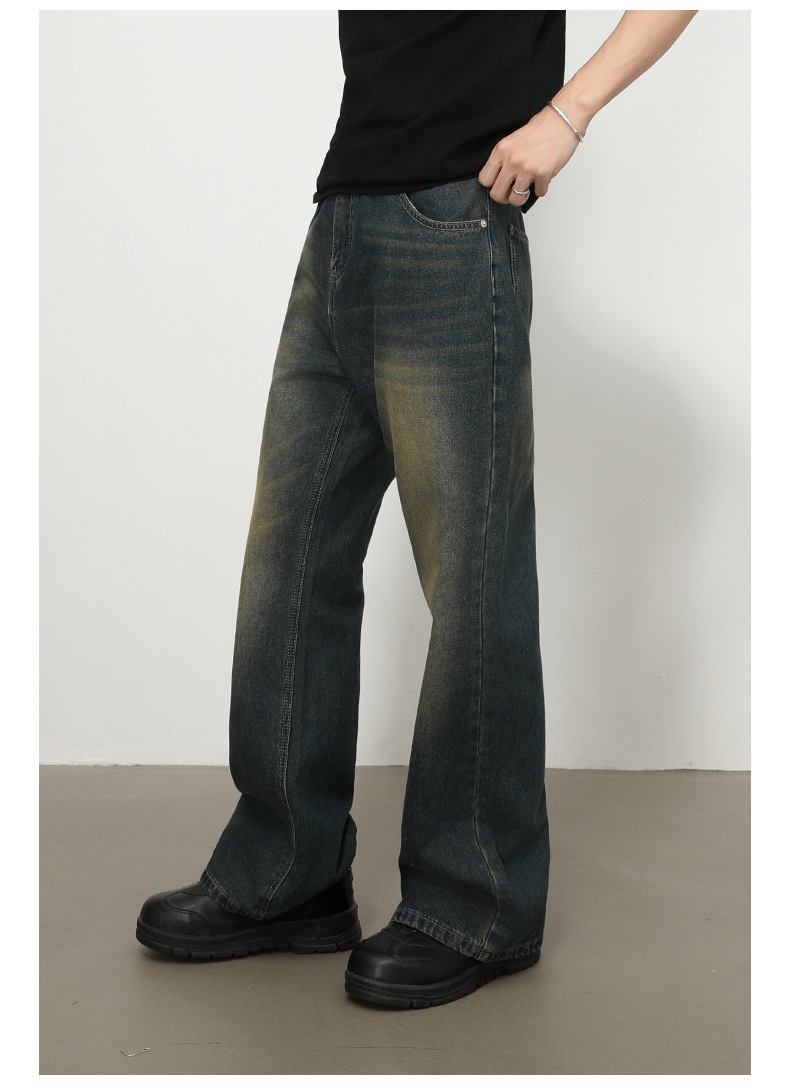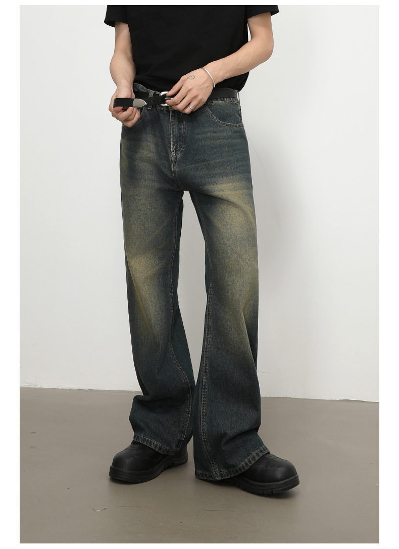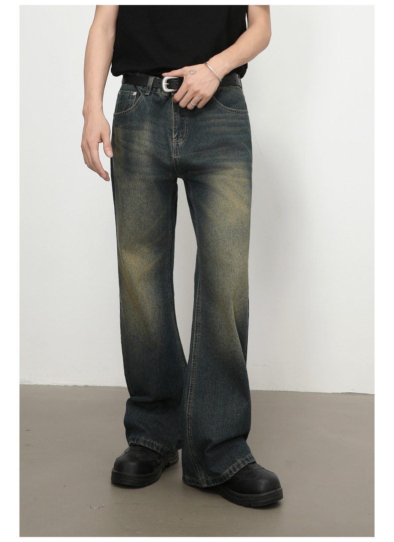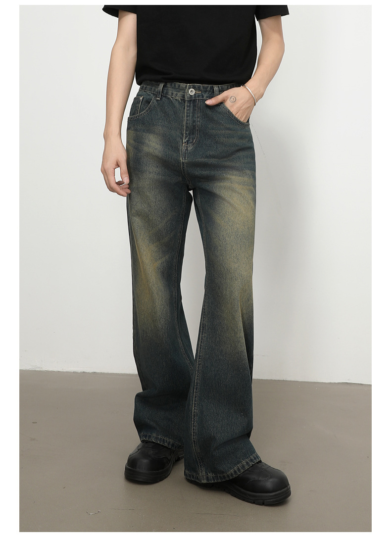 nirben牛仔|港风时尚复古做旧微喇叭牛仔裤男宽松显瘦百搭长裤