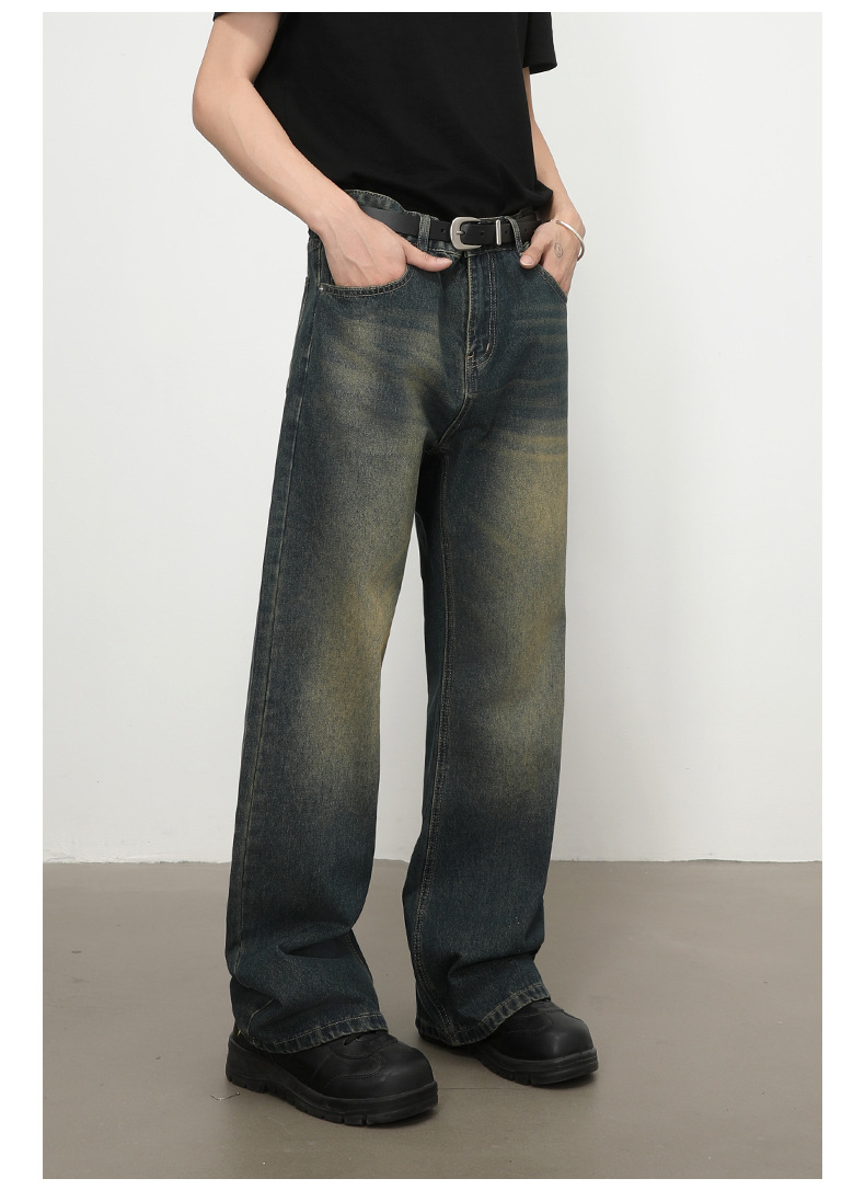 nirben牛仔|美式高街猫须纹水洗牛仔裤男新款微喇叭宽松直筒长裤