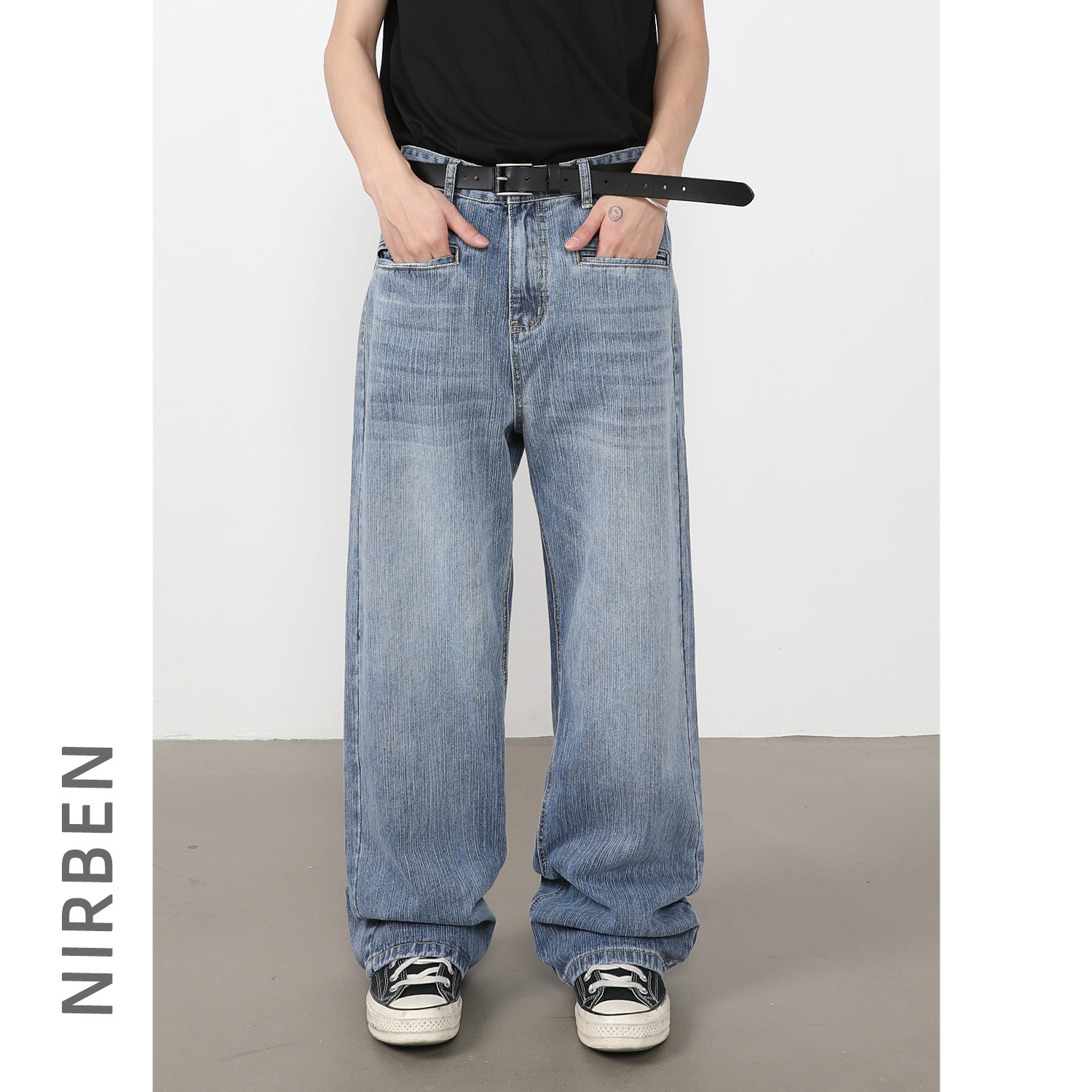 nirben牛仔|新款美式复古竹节纹前口袋设计牛仔裤男宽松直筒长裤