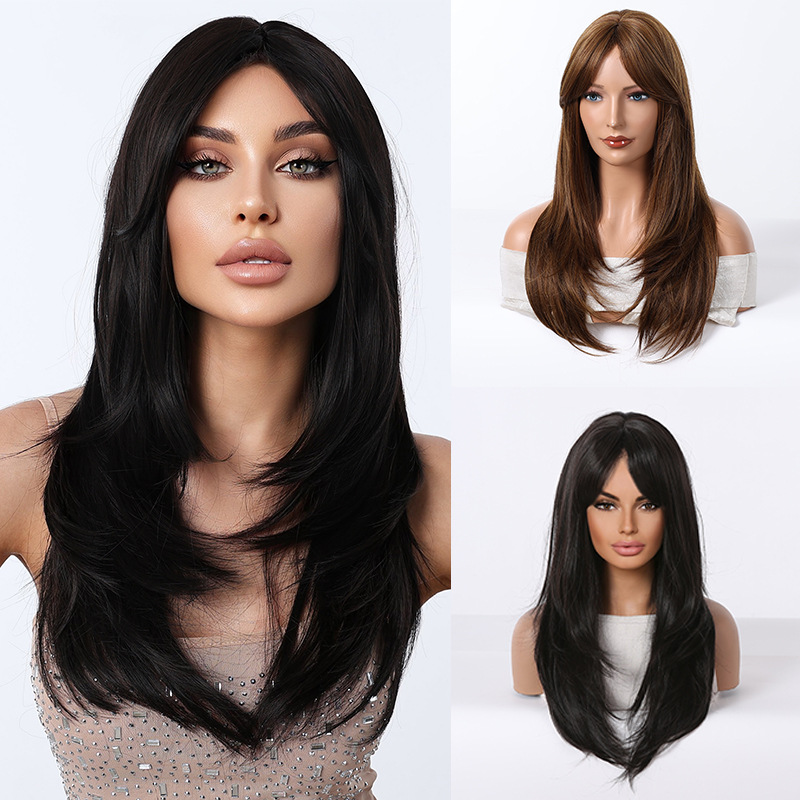 跨境假发女士八字刘海多层次长直发时尚化纤机制黑棕色全头套假发