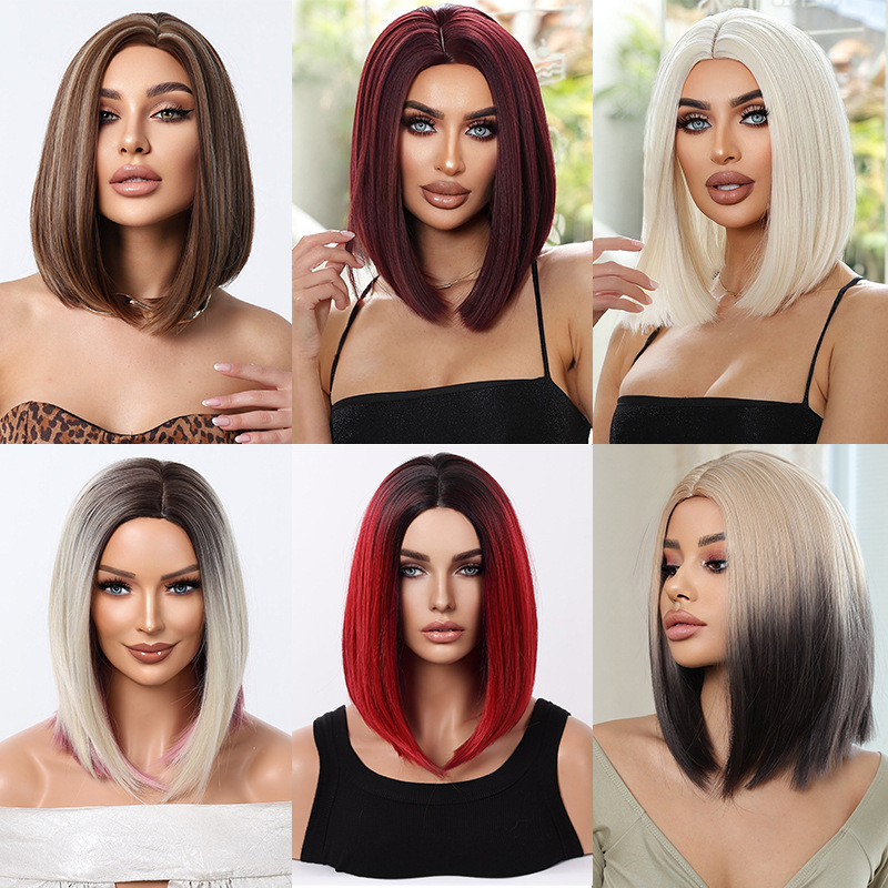 亚马逊跨境欧美新品假发中分短直发bobo头时尚酒红色锁骨发波波头