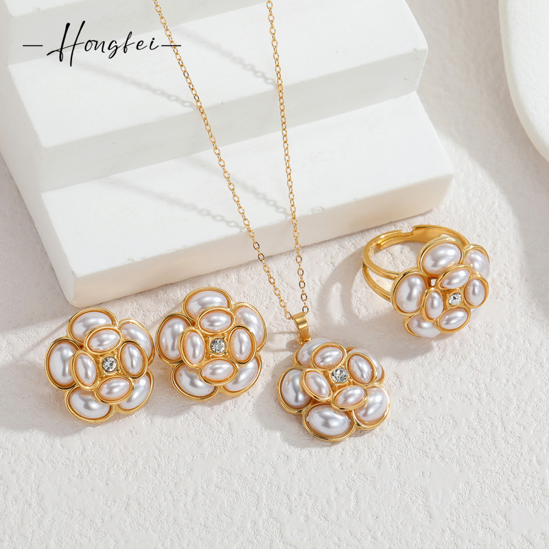 欧美时尚不锈钢18k金立体花朵珍珠项链ins波西米亚轻奢项链配饰女