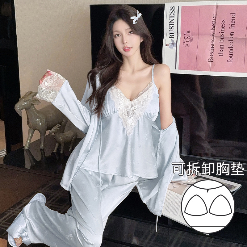 薇尔妮丝春夏睡衣女款冰雪丝高级感纯欲吊带三件套装带胸垫家居服
