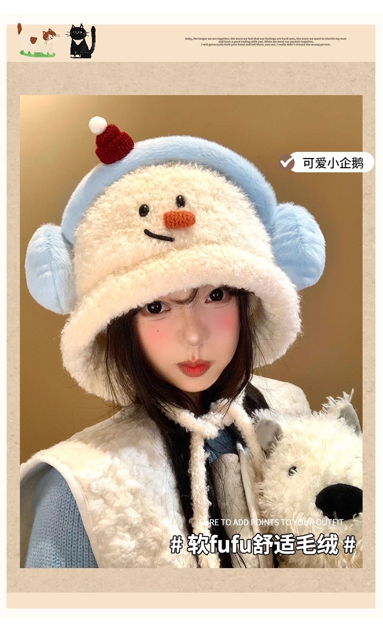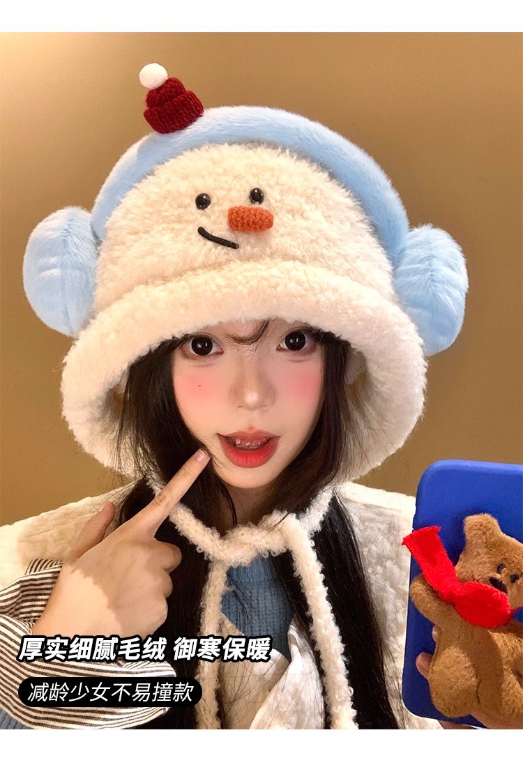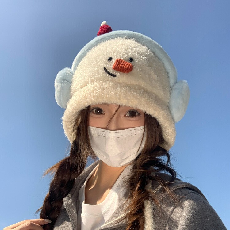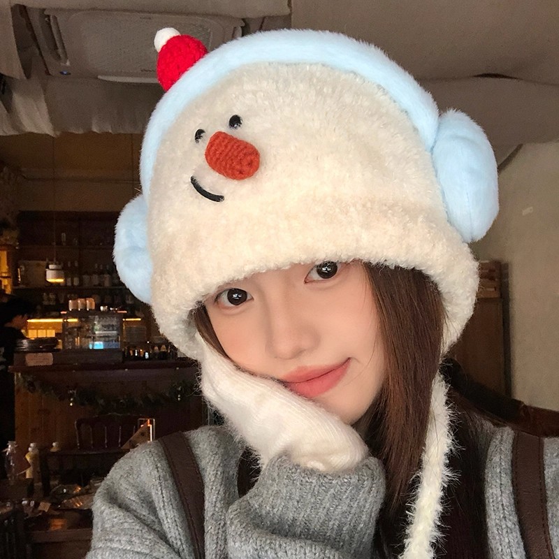 2025年冬季新款可爱小雪人百搭好看加绒加厚保暖毛绒帽奶油甜妹风