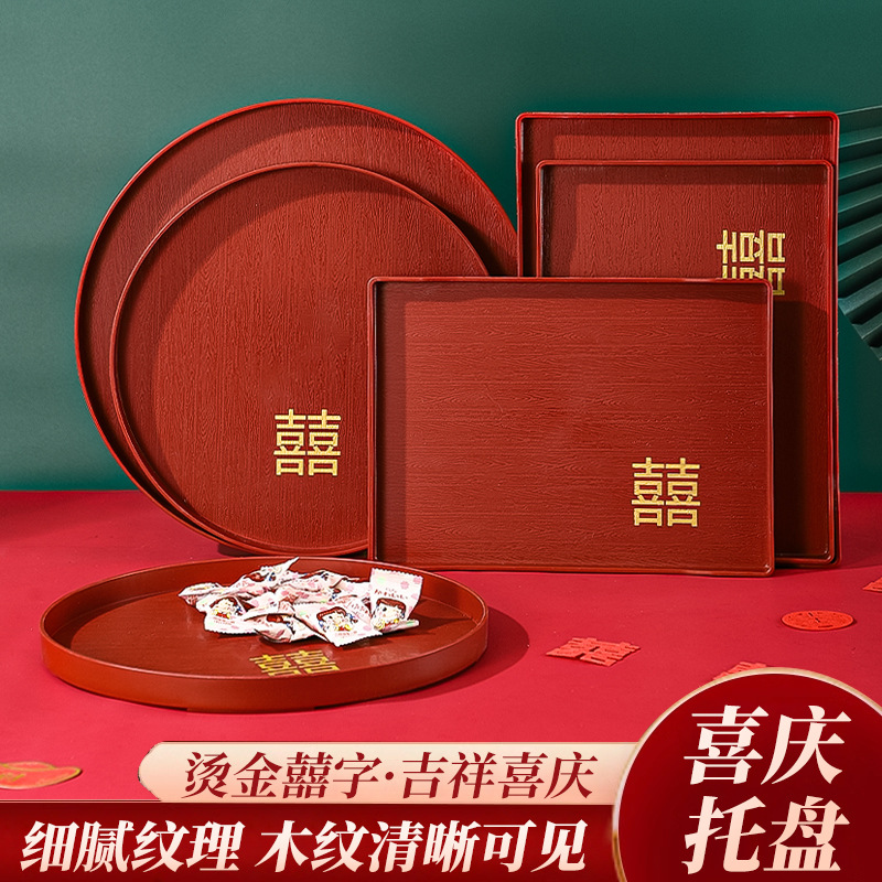 中国の赤いホテルのトレイ長方形の丸い食器トレイ赤いトレイホテルの結婚式のティートレイドライフルーツトレイ