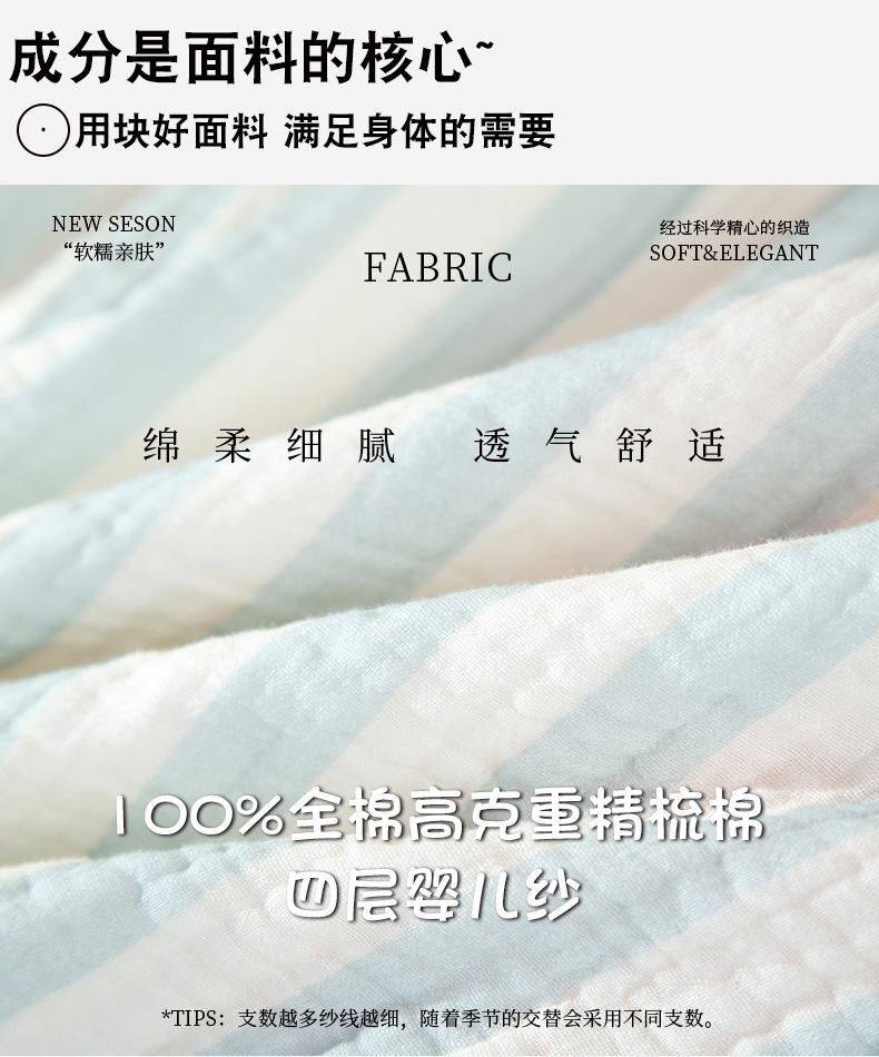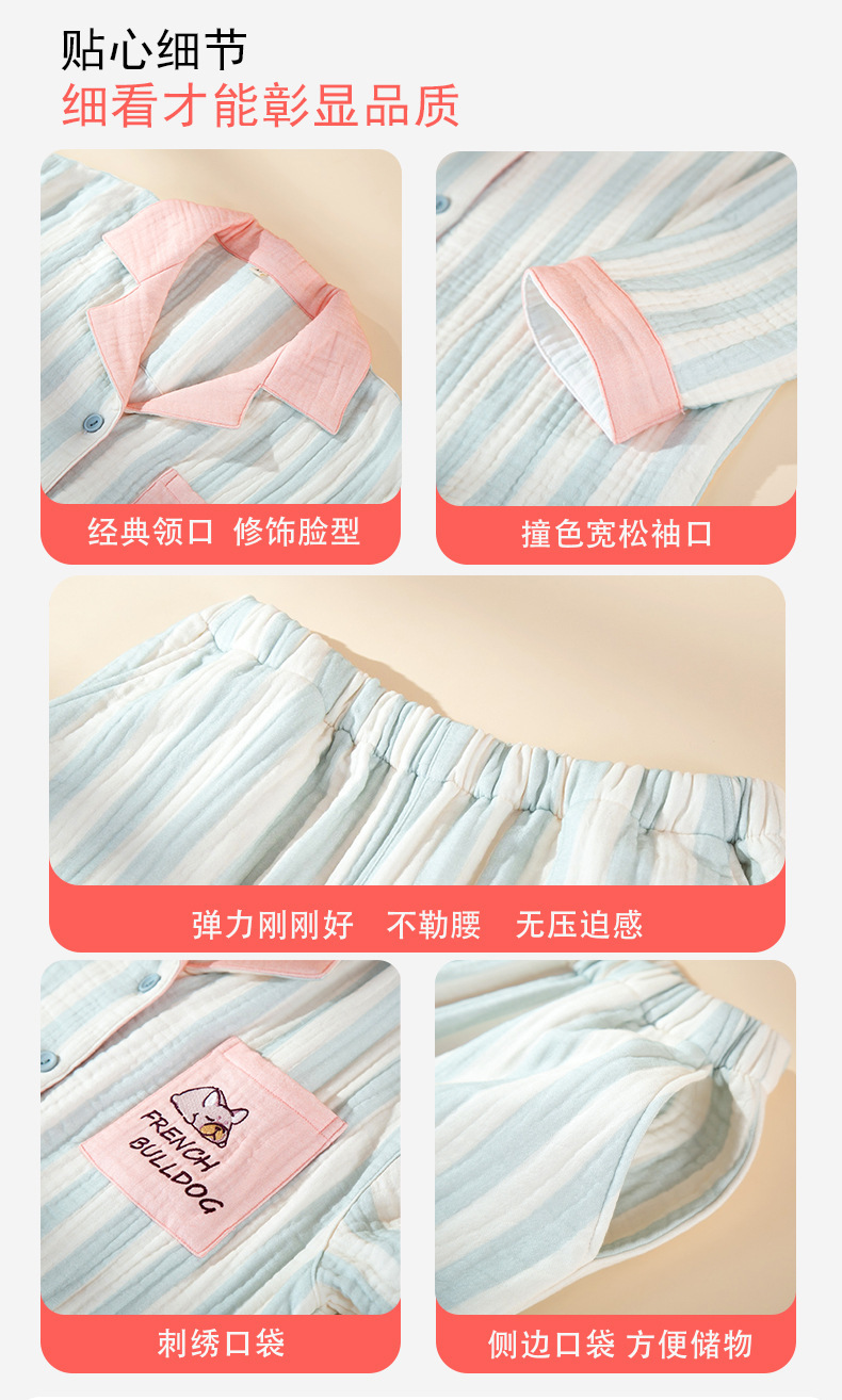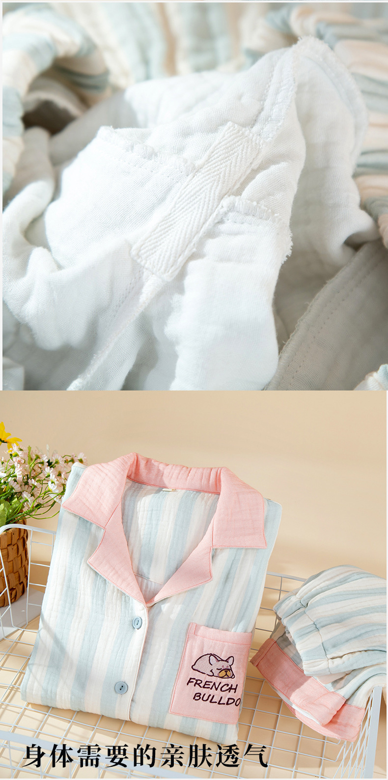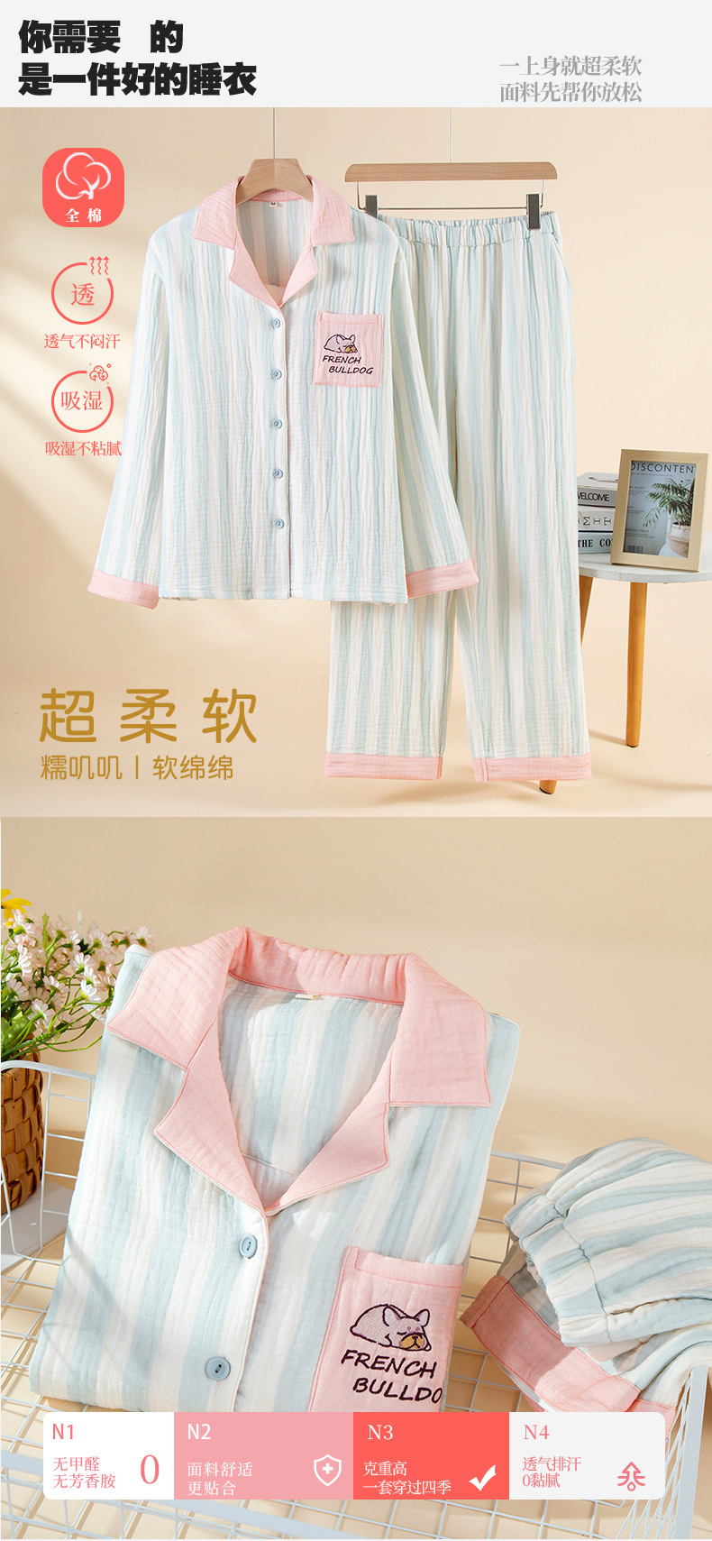 纯棉纱布四层加厚睡衣女春秋冬季新款条纹卡通刺绣长袖长裤家居服
