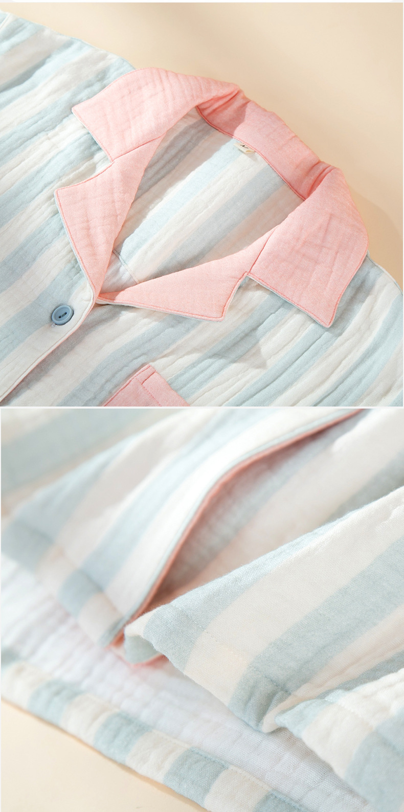 A类纯棉四层皱纱睡衣女春秋冬季鸢尾瓢虫翻领常规家居服套可外穿