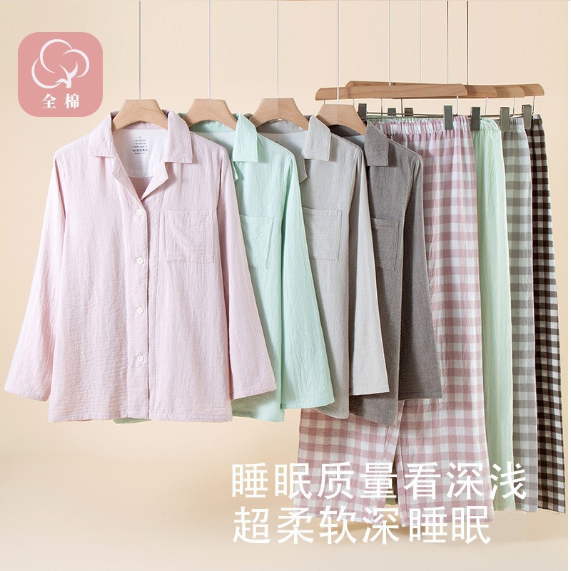 春と秋の純綿二重ガーゼレディースチェック柄パジャマセット、屋外でも着用可能、和風夏用ホームウェア、和風シンプル