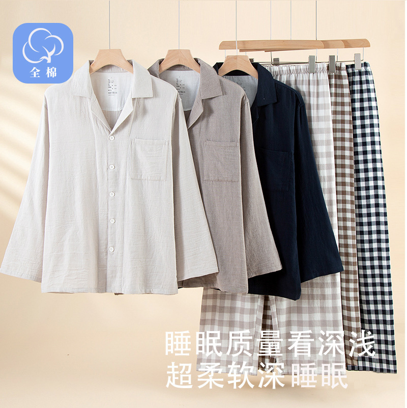 A类全棉双层纱布睡衣男春秋款无印风家居服男翻领宽松睡衣可外穿