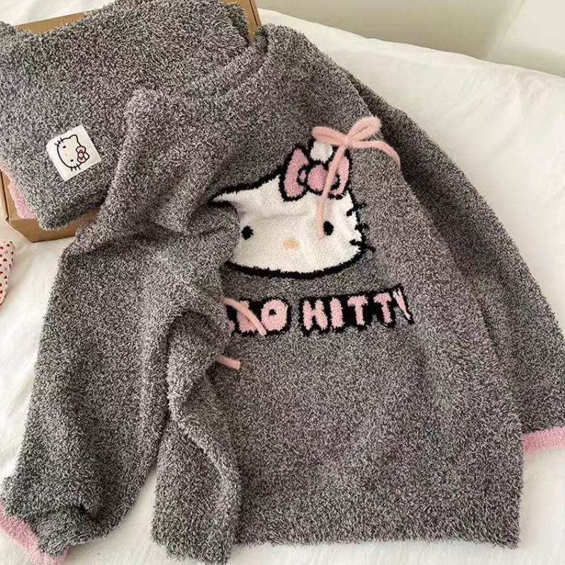 韩系可爱卡通蝴蝶结长袖珊瑚绒睡衣女秋冬新款长裤家居服两件套