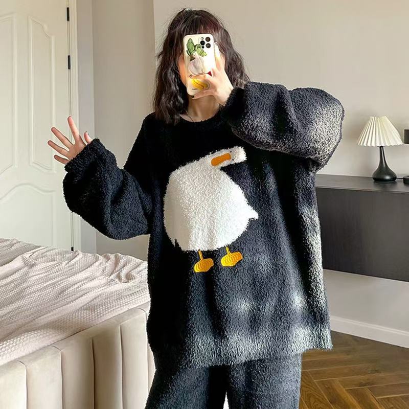 半边绒软绵绵睡衣女秋冬季加绒加厚珊瑚绒睡衣大码休闲居家服套装