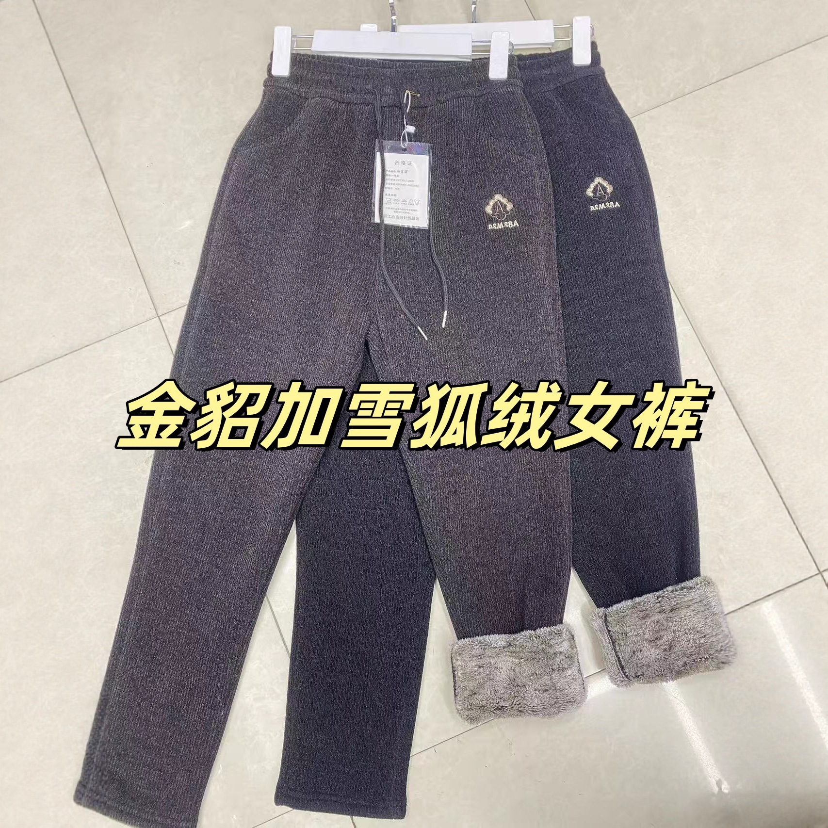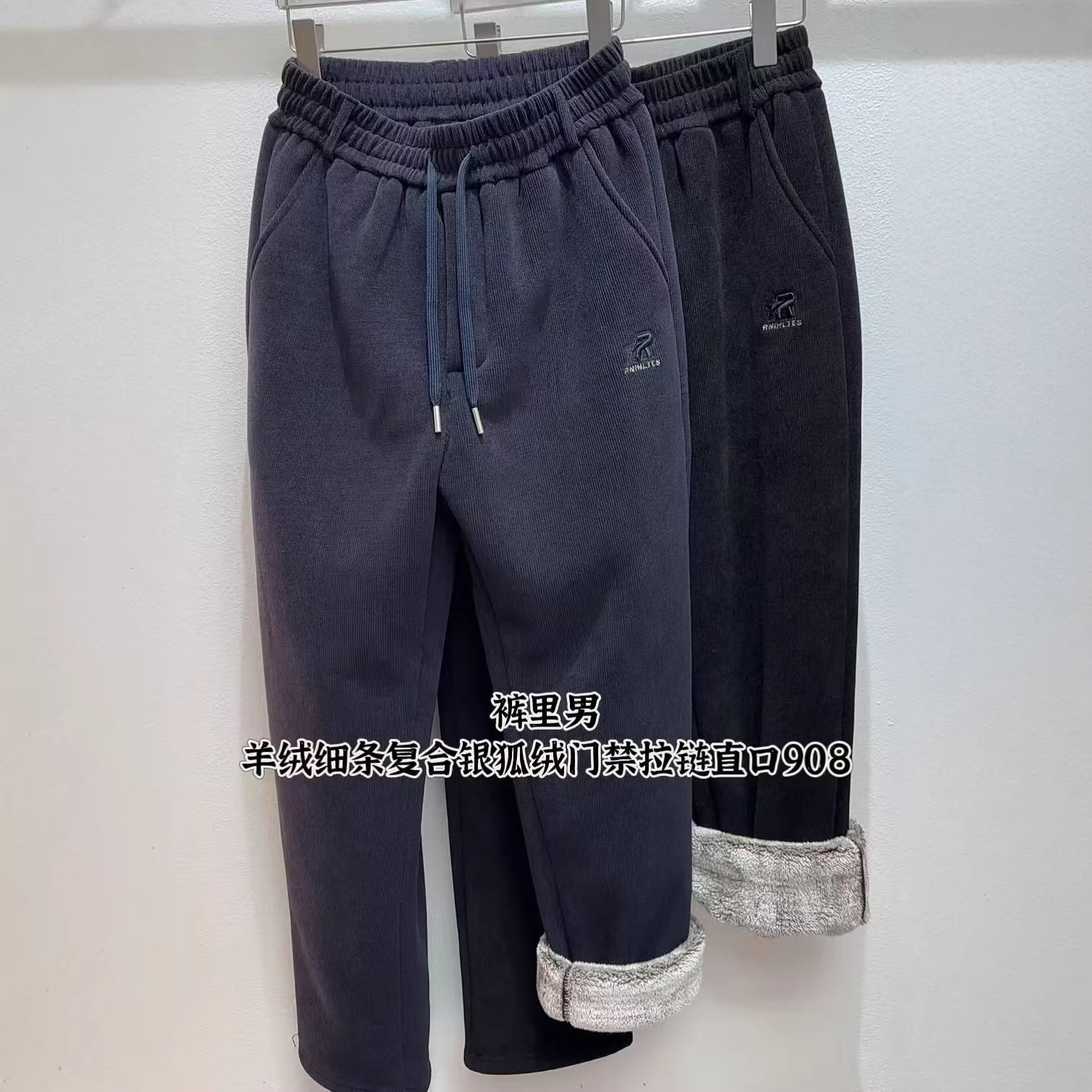 2025冬针织仿牛仔时尚潮流配布拉绳宽松休闲直筒裤加雪狐绒厚长裤