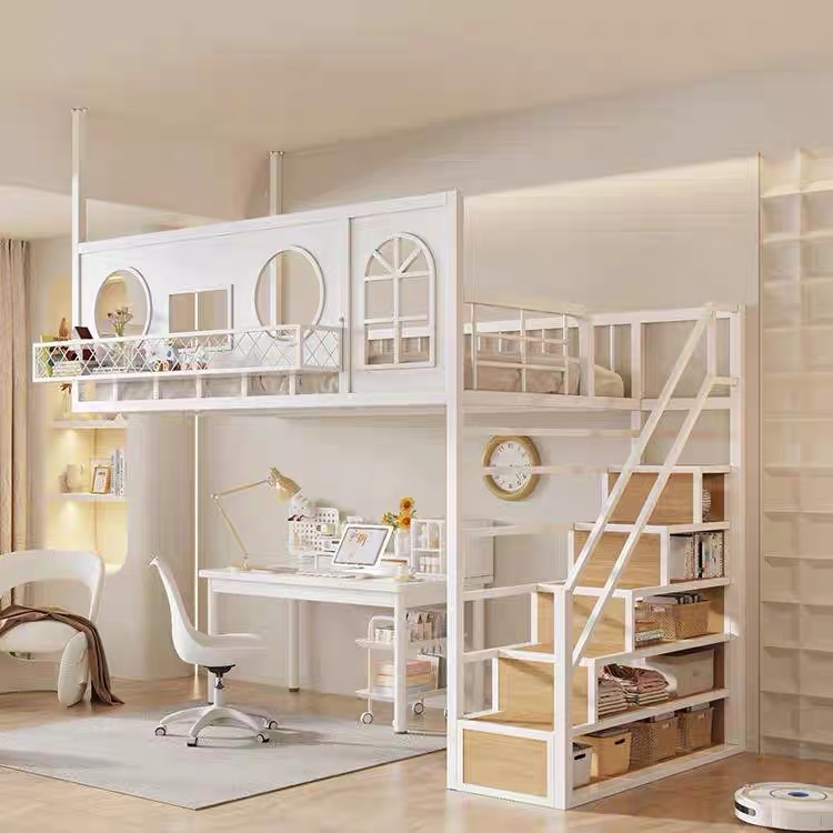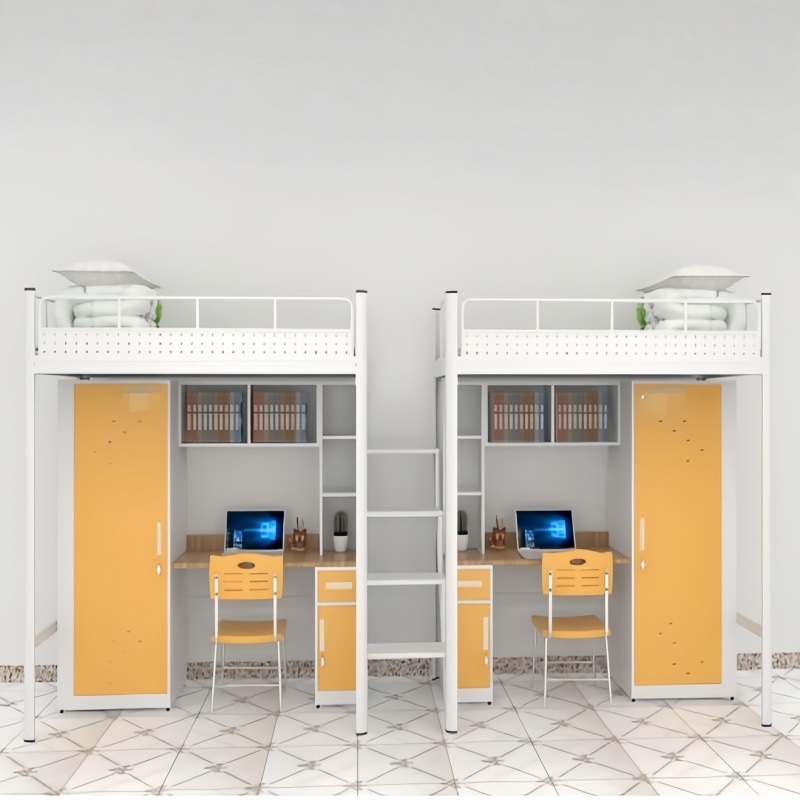 ベッドとテーブルの組み合わせ アパートメントベッド 大学寮の二段ベッド 床から天井までのはしご 鋼材と木材を組み合わせた二段ベッド