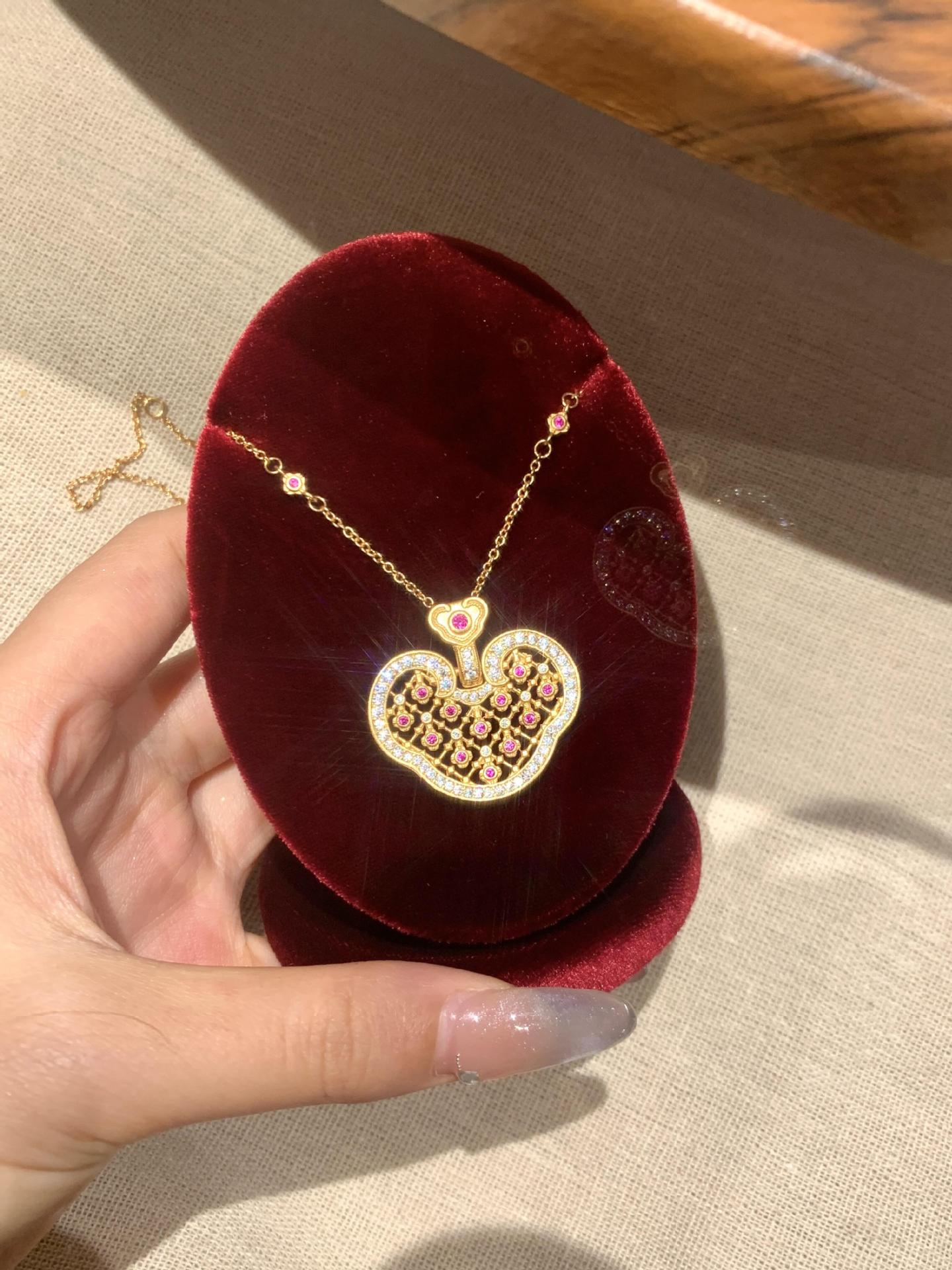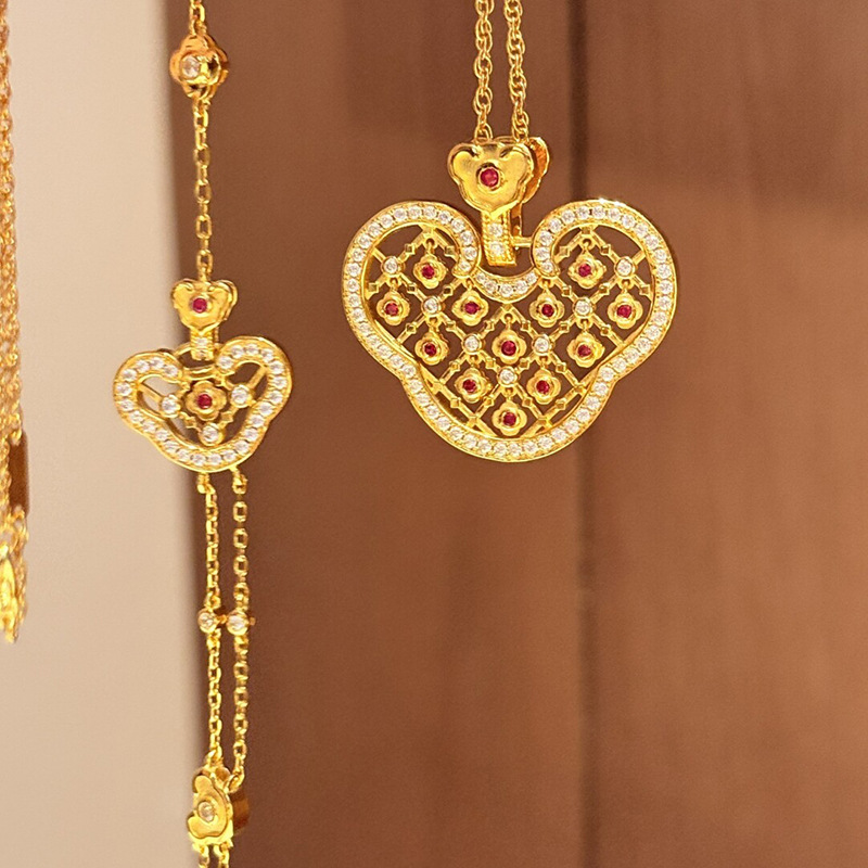 露思同款沙金玫红钻如意锁包项链灵动花丝镂空祥云福启锁包锁骨链