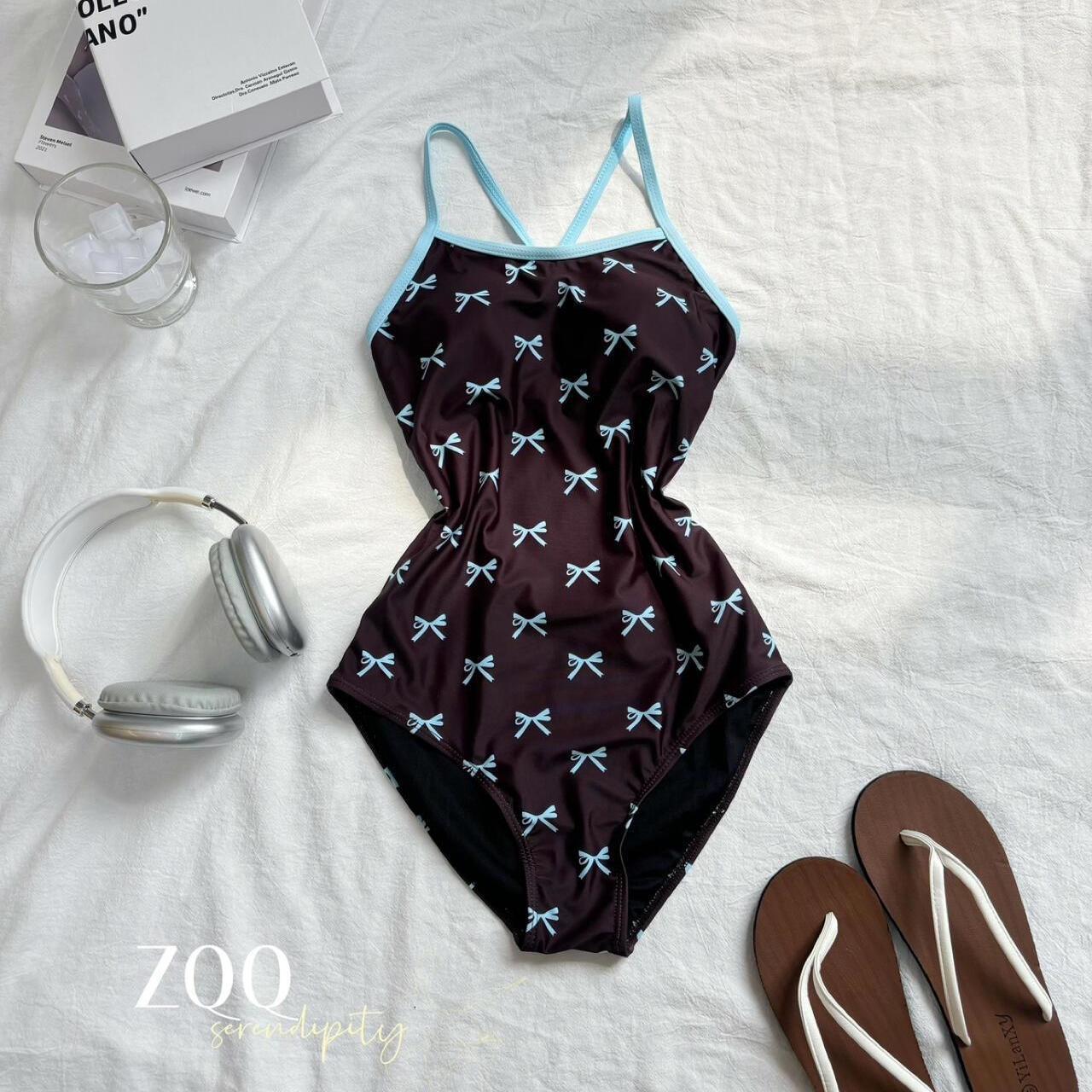 【蓝调蝴蝶结】复古印花显瘦速干连体泳衣游泳馆竞速女度假风海边