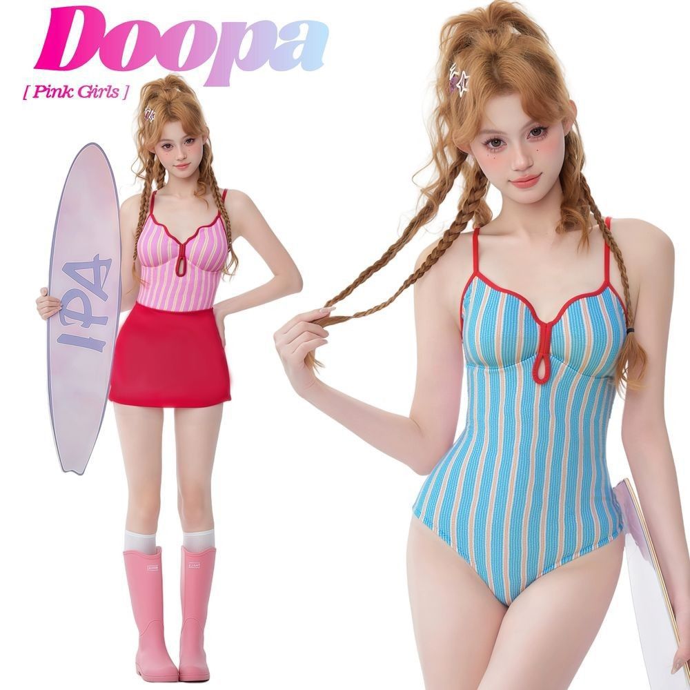 Pink Girls原创泳衣女2025新款连体裙式两件套条纹少女风显瘦泳装