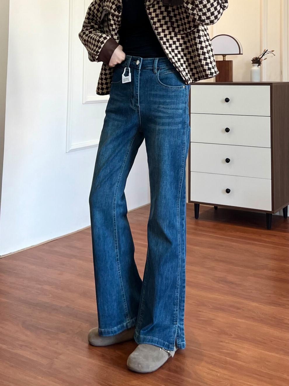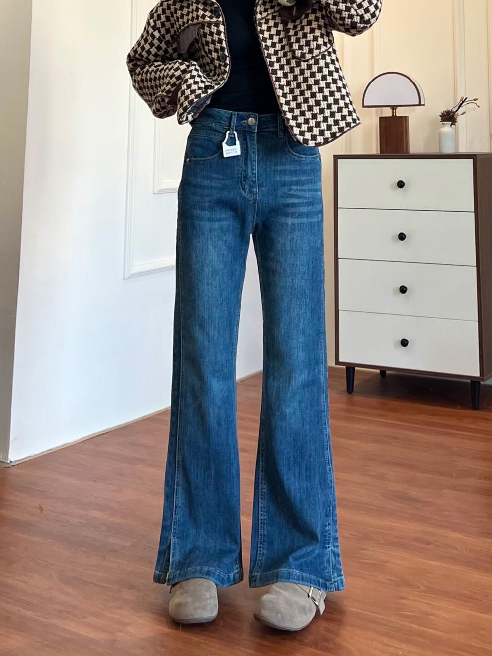 加绒开叉微喇牛仔裤女秋冬大码胖mm梨形身材高腰显瘦直筒微喇裤子