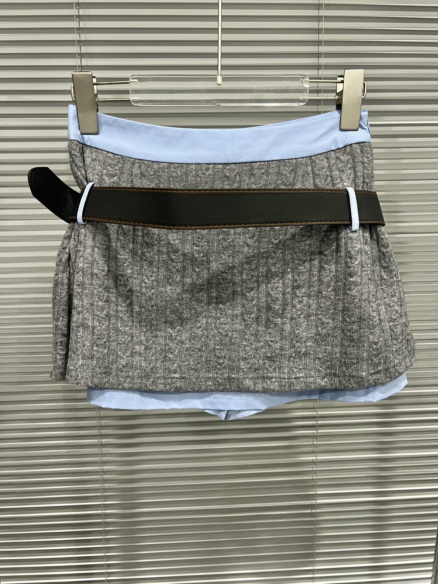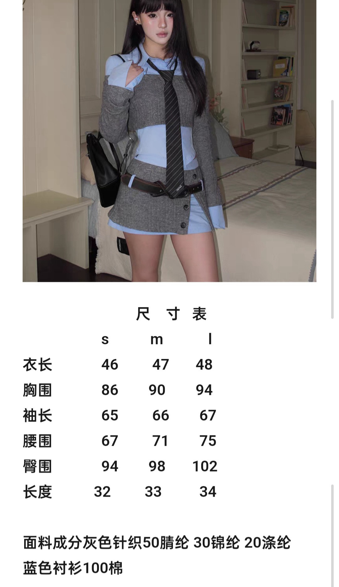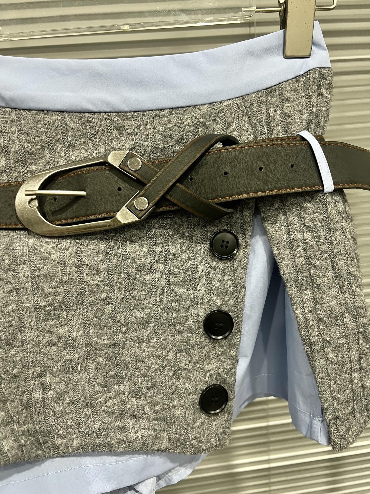 2025秋冬新款绞花毛织毛衫海盐蓝衬衫拼接假两件套上衣半裙套装