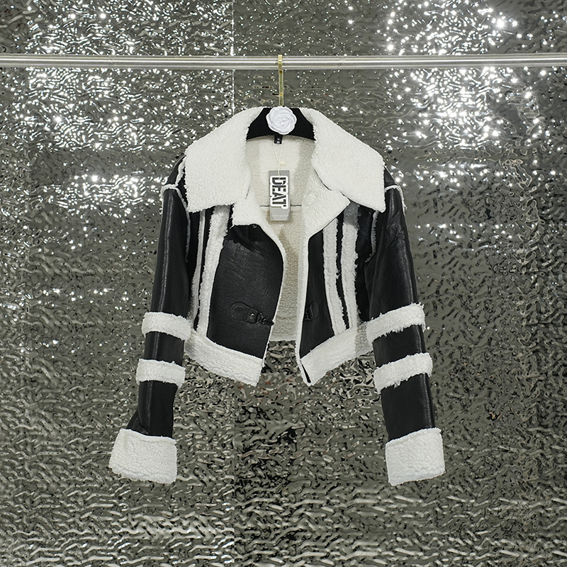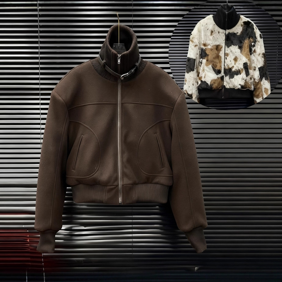 2025新款时尚女装毛绒两面穿呢子外套保暖时尚奶牛纹立领短上衣