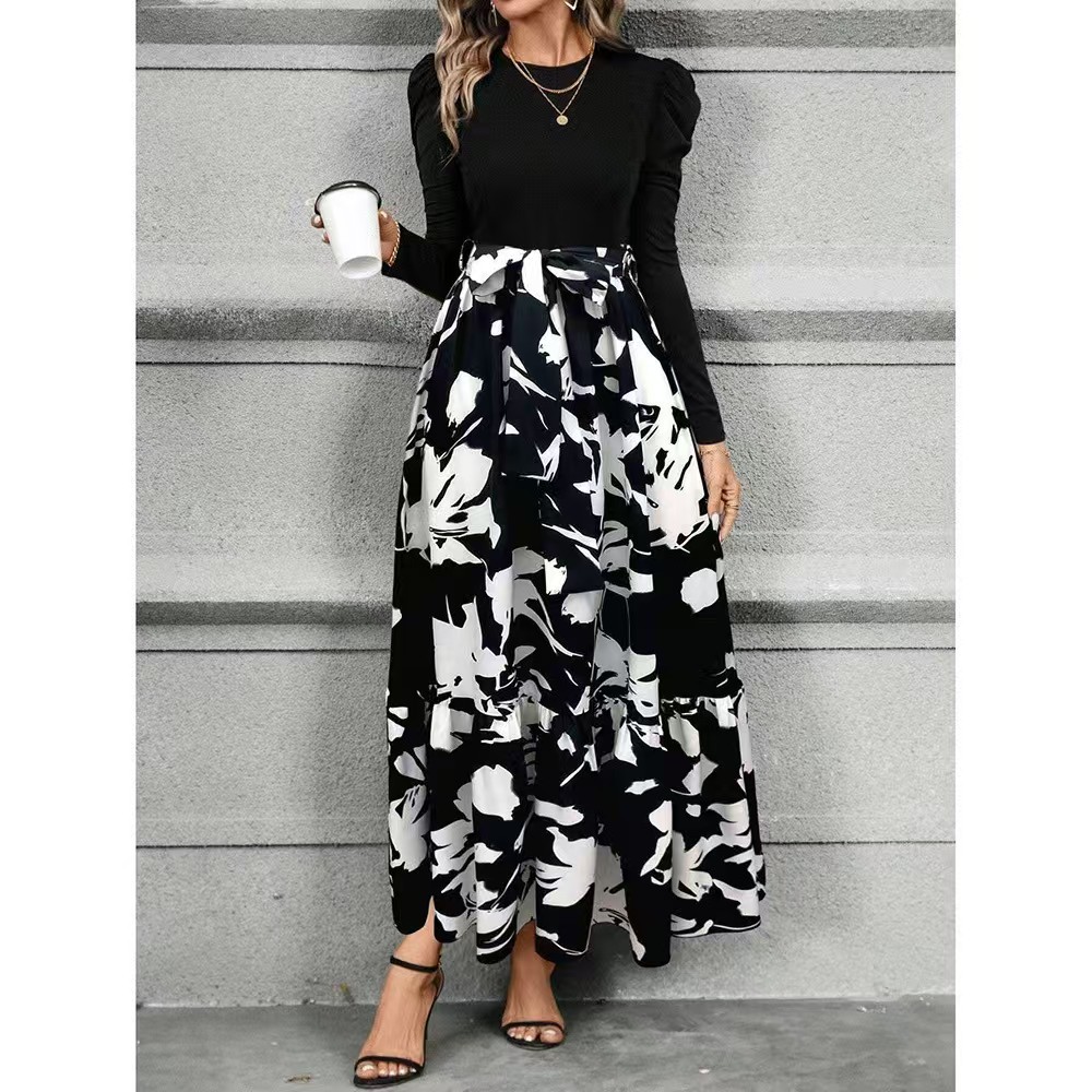 2025跨境女装秋季爆款花卉印花圆领长袖连衣裙异域度假风优雅长裙