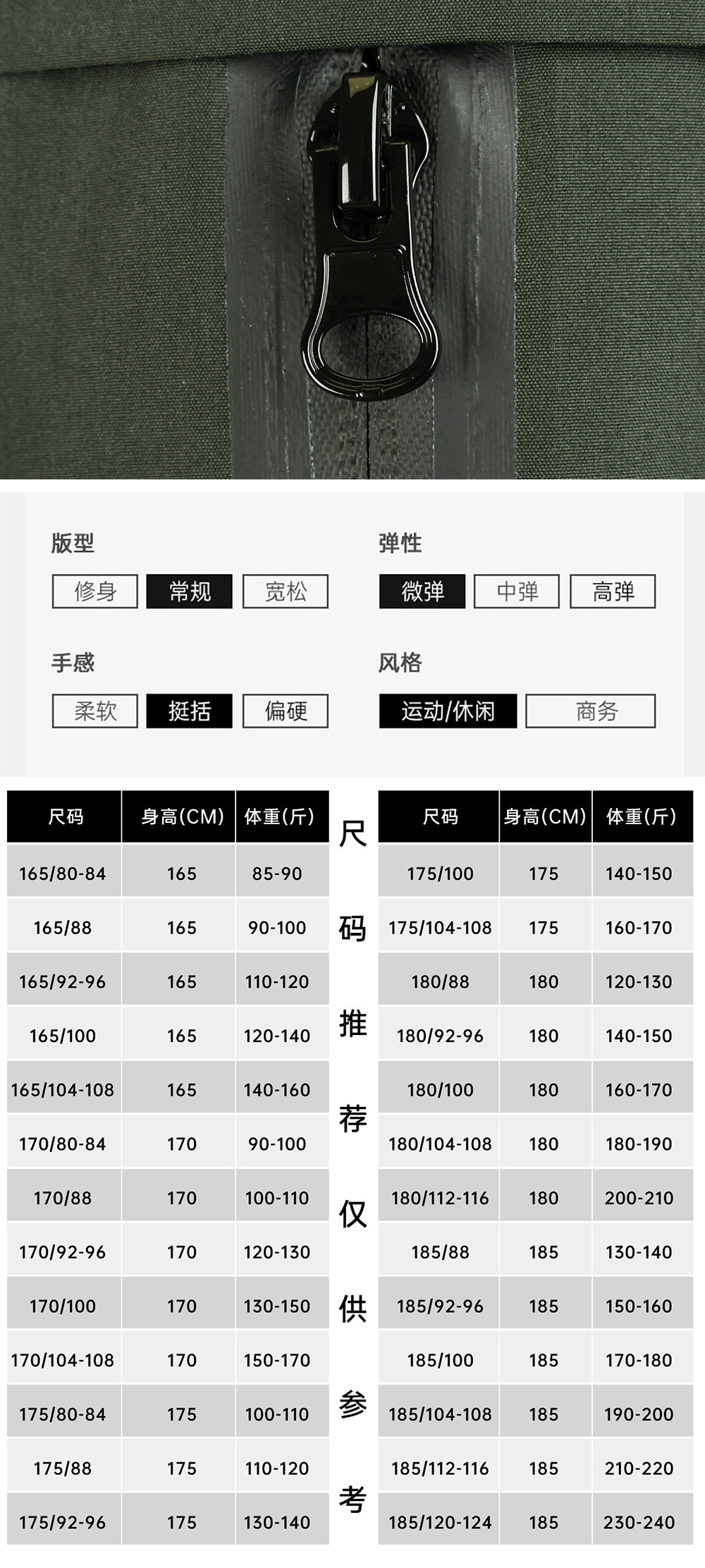 165cm/80-84/85-90斤,165cm/88/90-100斤,165cm/92-96/110-120斤,165cm/100/120-140斤,165cm/104-108/140-160斤,170cm/80-84/90-100斤,170cm/88/100-110斤,170cm/92-96/120-130斤,170cm/100/130-150斤,170cm/104-108/150-170斤,175cm/88/110-120斤,175cm/92-96/130-140斤,175cm/100/140-150斤,175cm/104-108/160-170斤,180cm/88/120-130斤,180cm/92-96/140-150斤,180cm/100/160-170斤,180cm/104-108/180-190斤,180cm/112-116/200-210斤,185cm/88/130-140斤,185cm/92-96/150-160斤,185cm/100/170-180斤,185cm/104-108/190-200斤,185cm/112-116/210-220斤